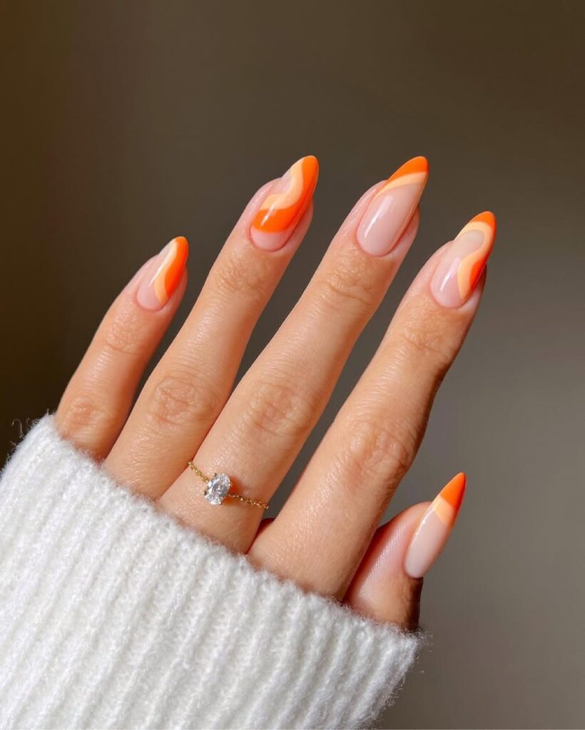 A vibrant pop of orange injects pure spring energy into this manicure. Clean nude bases provide a grounded foundation, while the bright tips introduce a fresh, modern twist that feels confident and dynamic. This design successfully balances boldness with subtlety, offering a fun yet refined color statement that is ideal for those seeking impactful, yet unpretentious, nail art.