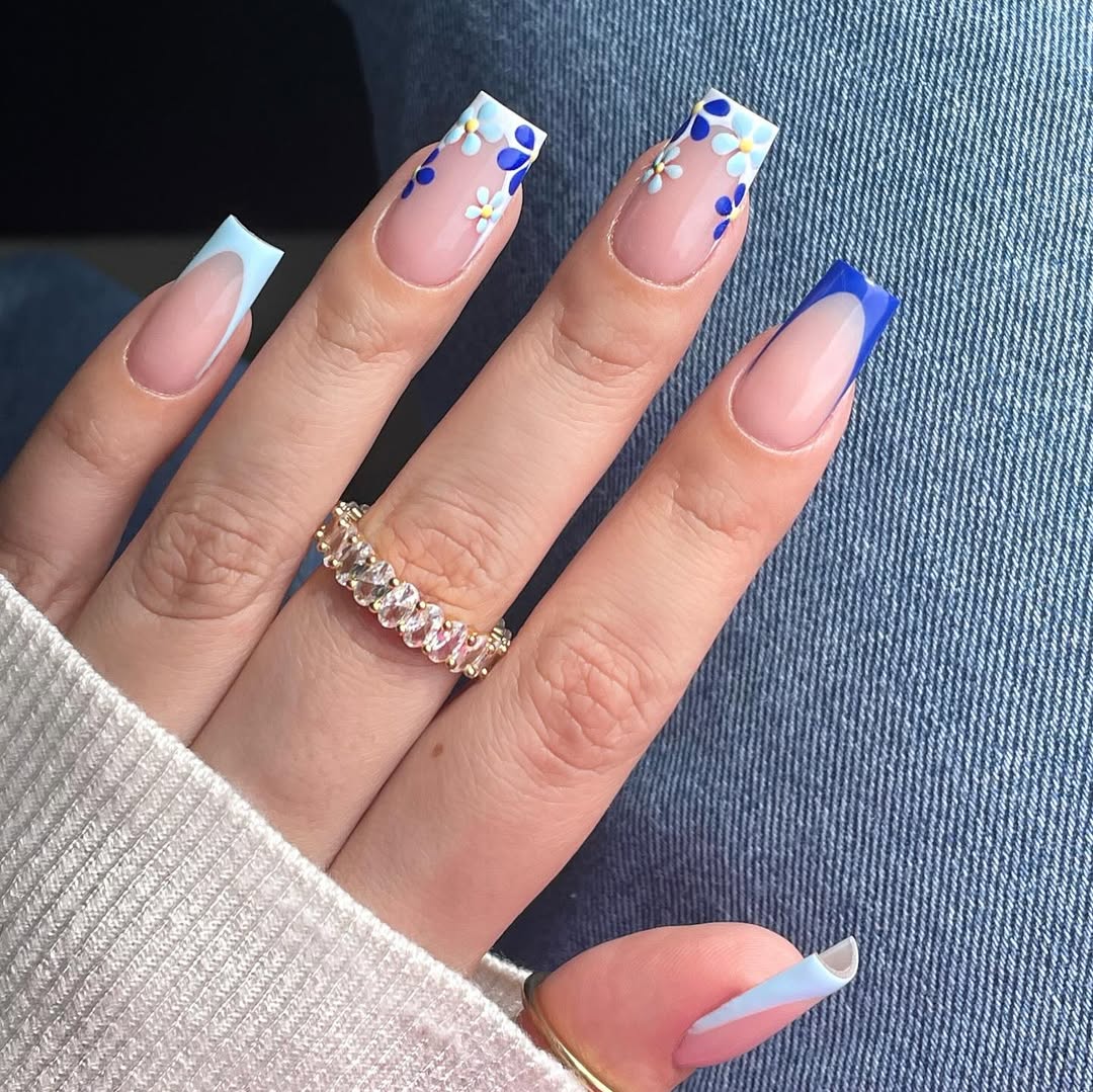 A classic French tip is revitalized with a fresh spring color. The soft blue tips offer a contemporary twist on the traditional style, maintaining a neat and highly wearable finish. This design effectively proves that simplicity need not be boring, offering clean lines, a refreshing color palette, and a subtle glow that instantly enhances the polished appearance of the hands.