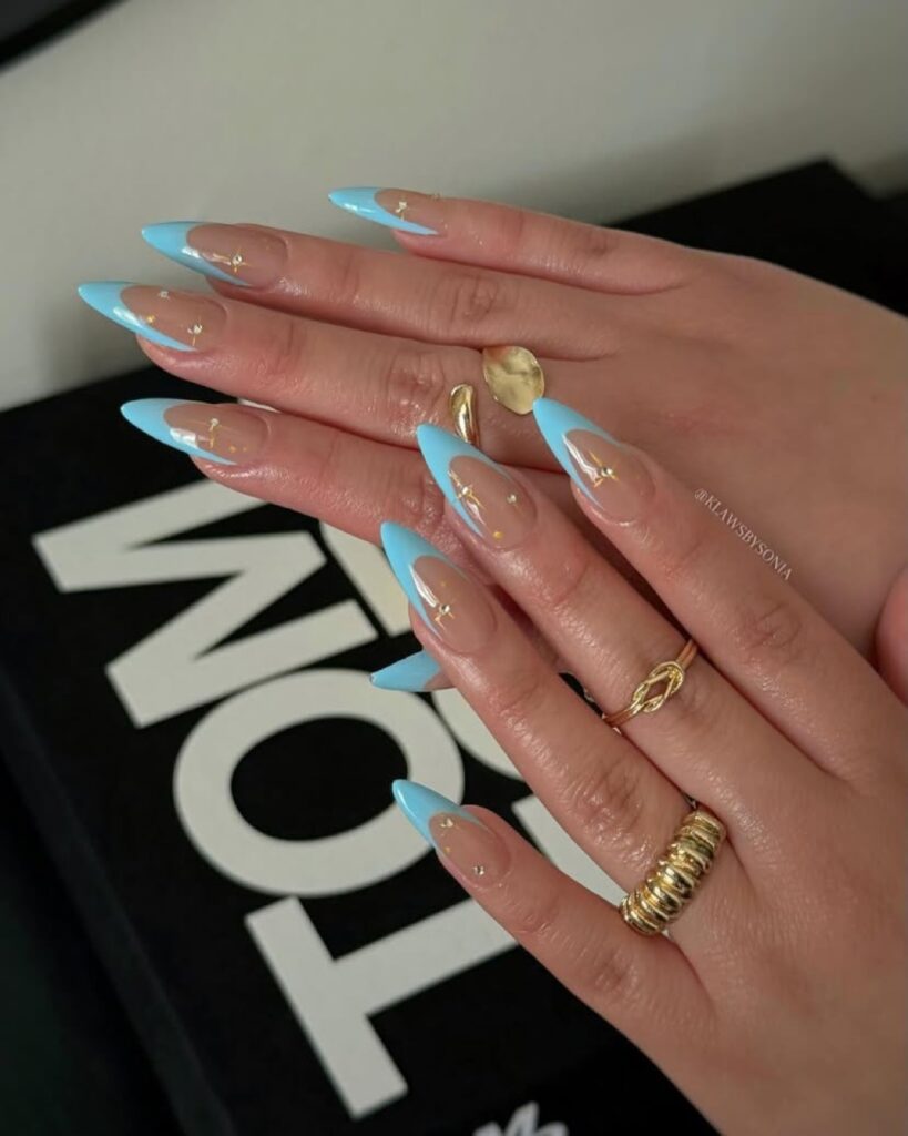 This baby-blue French manicure offers an immediate sense of calm and freshness, evoking the feeling of spring air drifting through an open window. Subtle gold accents catch the light, adding interest without detracting from the overall polished look. It’s a clean, classy, and quietly confident style, perfect for various occasions, from casual coffee meetings to impromptu mirror selfies.