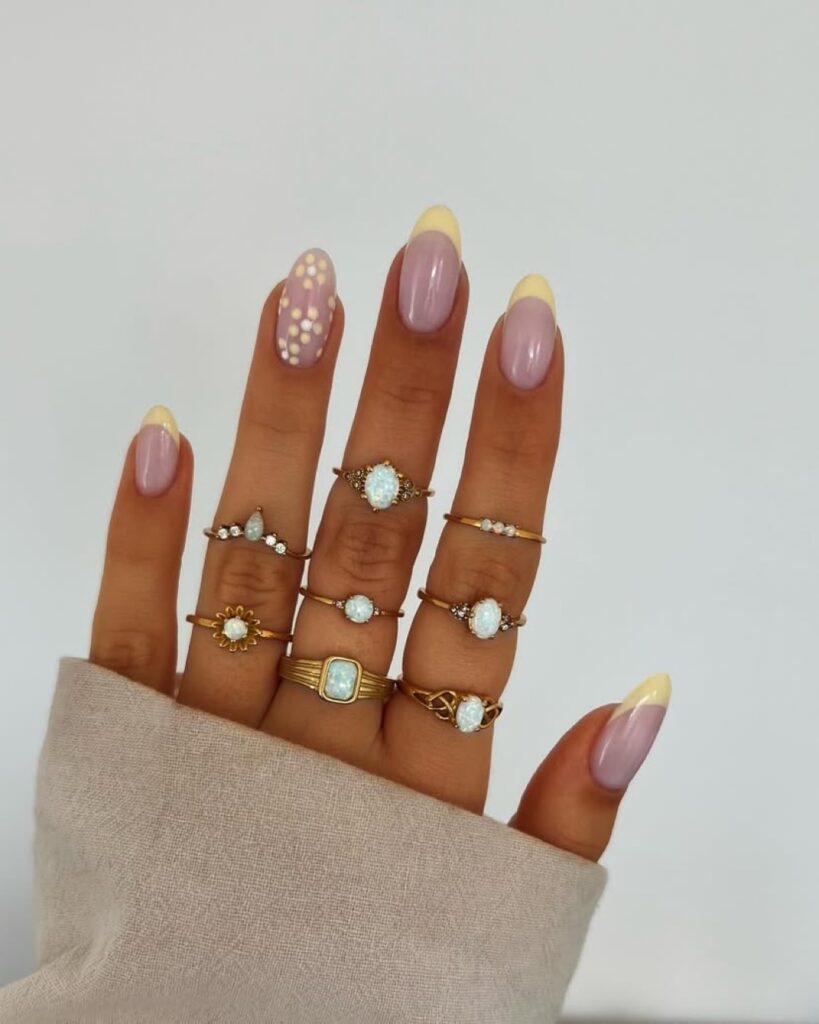 This nail design perfectly captures the essence of quiet spring sophistication. The foundation of pale pink is complemented by soft, buttery yellow tips, creating a look that feels fresh and understated, reminiscent of the first gentle morning sun after a long winter. It’s a clean, versatile style that manages to feel uniquely special without being ostentatious, ideal for those seeking spring nails that harmonize with any outfit while maintaining a deliberate, chic appearance.