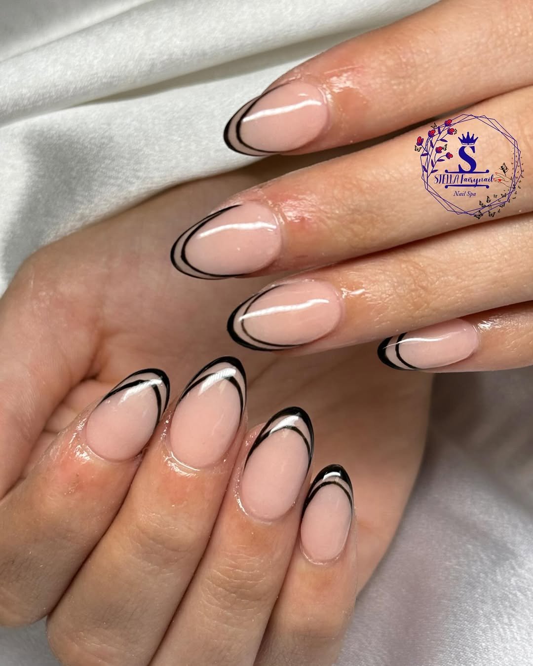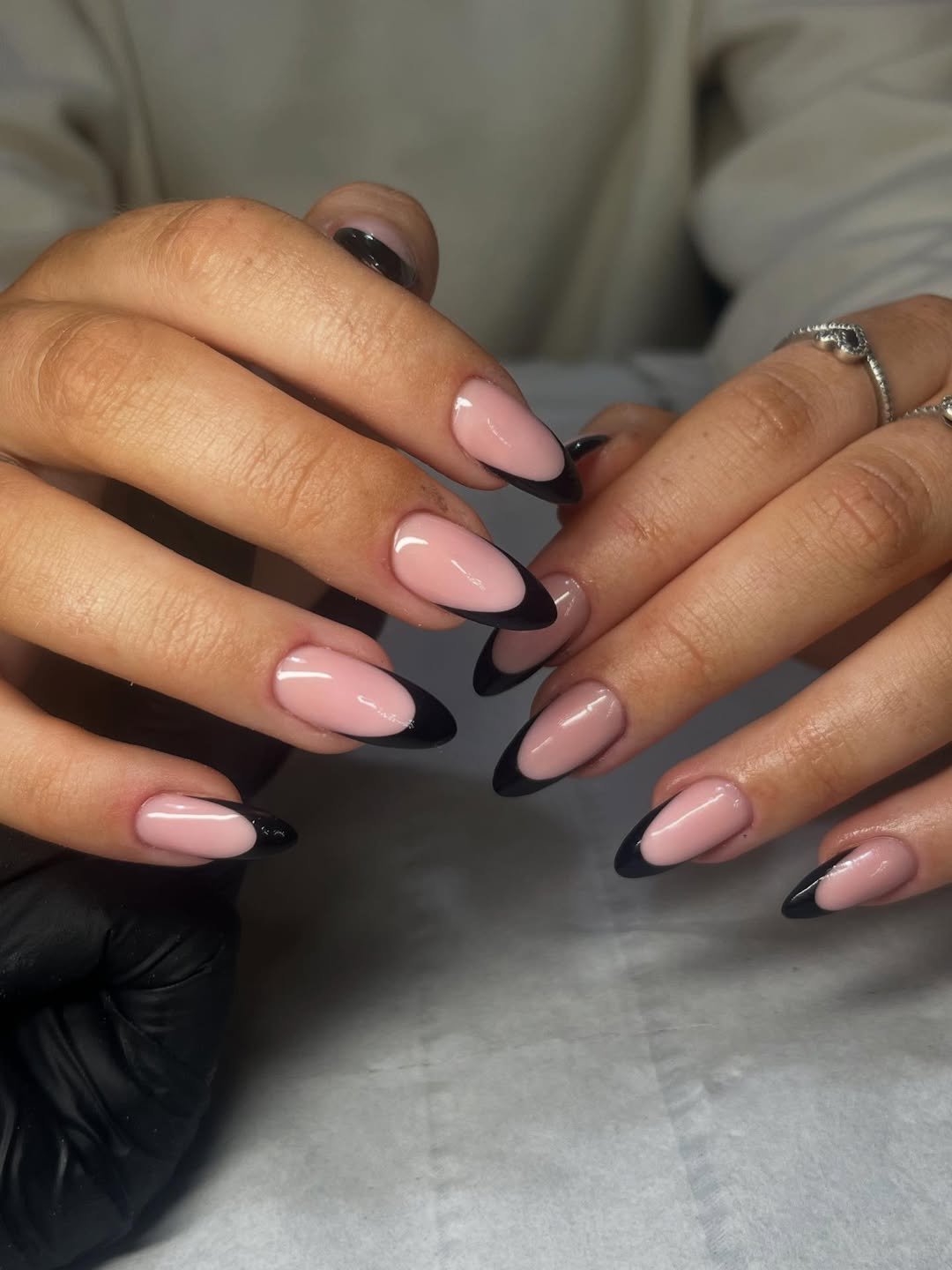 Adhering to an almond shape, these nails maintain a timeless appeal with elegantly applied black tips that perfectly frame the soft pink base.