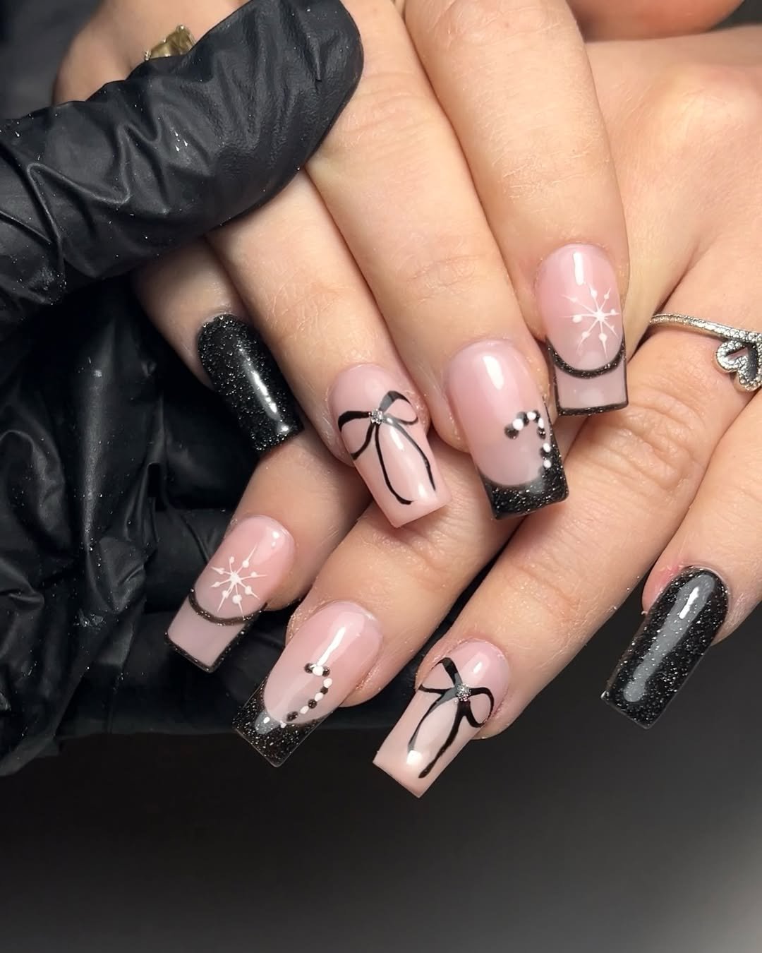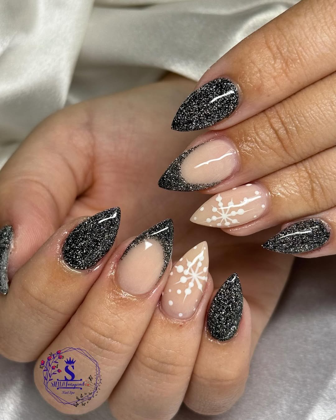 Matte nude bases are contrasted with glittery black tips, accented by delicate white snowflake details on select nails. The variation in texture creates a stunning visual effect.