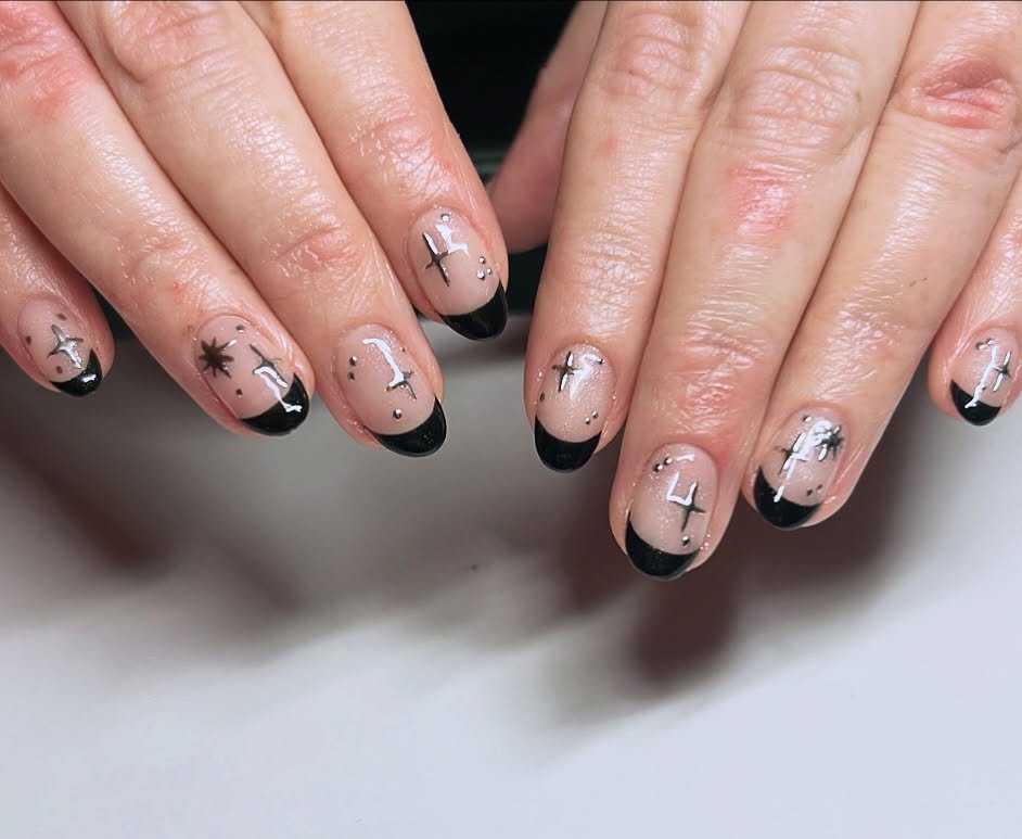 Short nude nails with glossy black tips are enhanced by tiny silver stars, crosses, and micro-dots scattered across the surface.