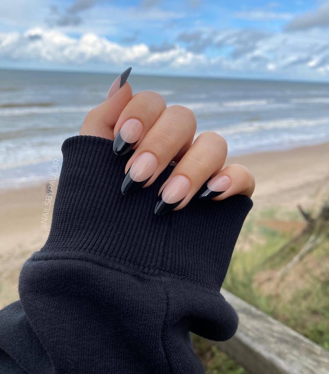 Short almond nails with glossy black tips and a soft nude base, presented in a seaside setting, create an instantly chic ambiance.