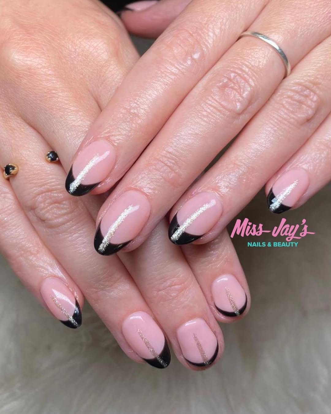 A soft blush base is combined with sleek diagonal black tips, elegantly accented by a fine silver glitter line. This design achieves subtle yet effective drama.