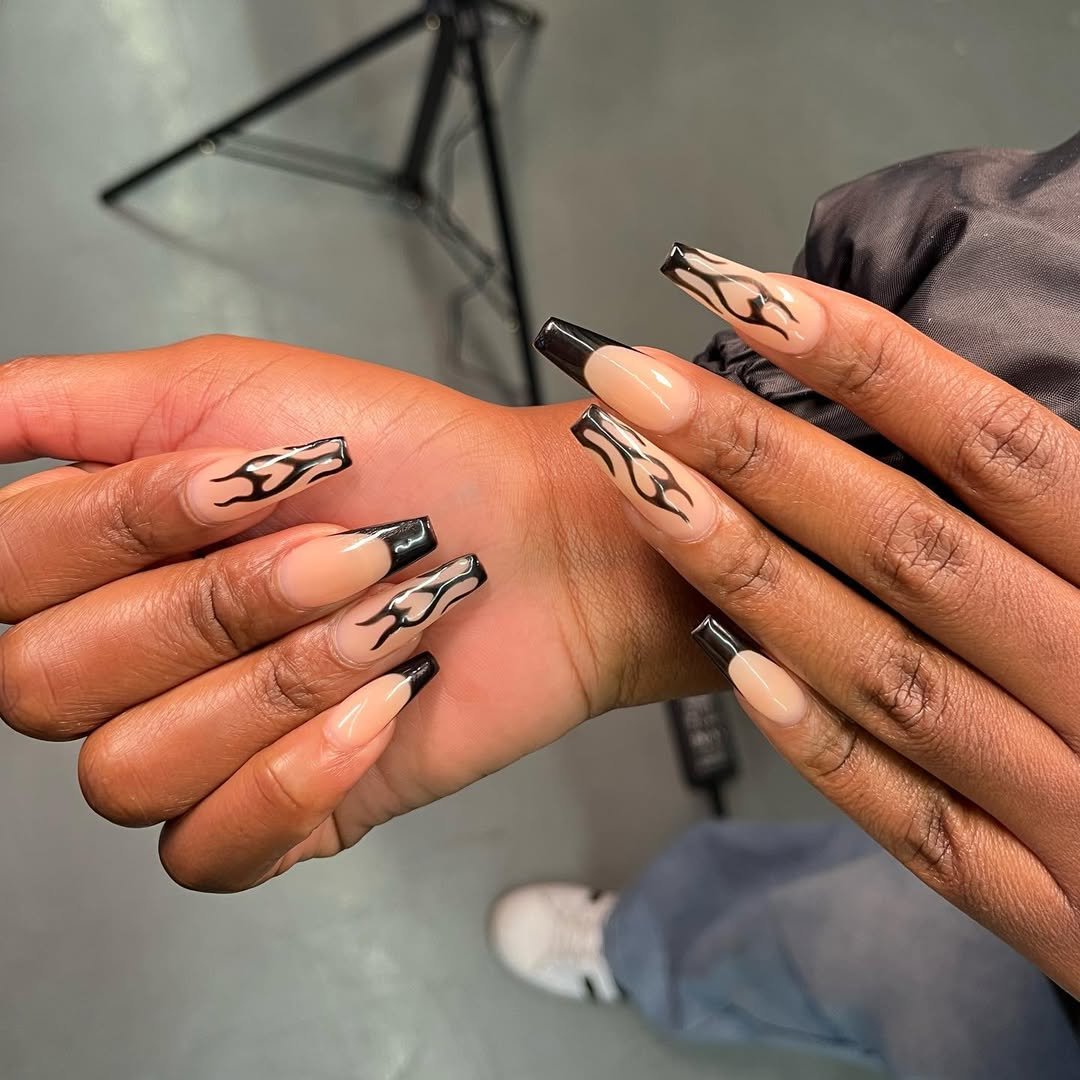 Long coffin nails feature glossy black tips that transition into delicate flame motifs against a nude base. The underlying soft pink hue ensures the design remains wearable while maintaining its edgy appeal.