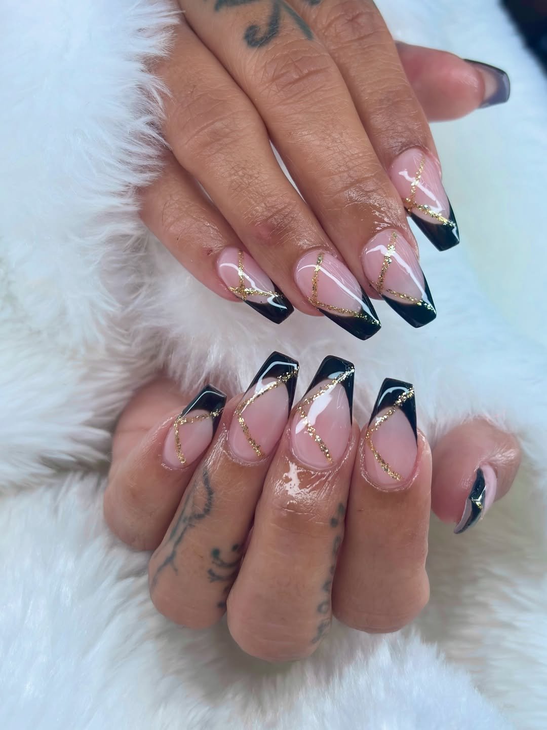 These glossy black tips are inherently stylish, but the delicate gold glitter lines that traverse the nude base add a captivating element, resembling miniature golden ribbons wrapped around each nail.