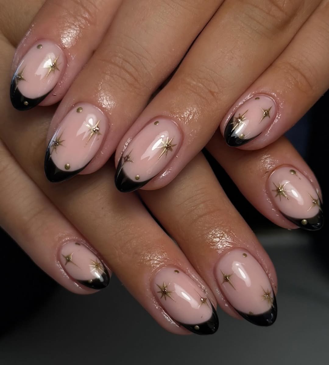 Black French tips are transformed with a celestial theme, featuring small gold studs and starburst accents scattered over a soft, milky pink base.