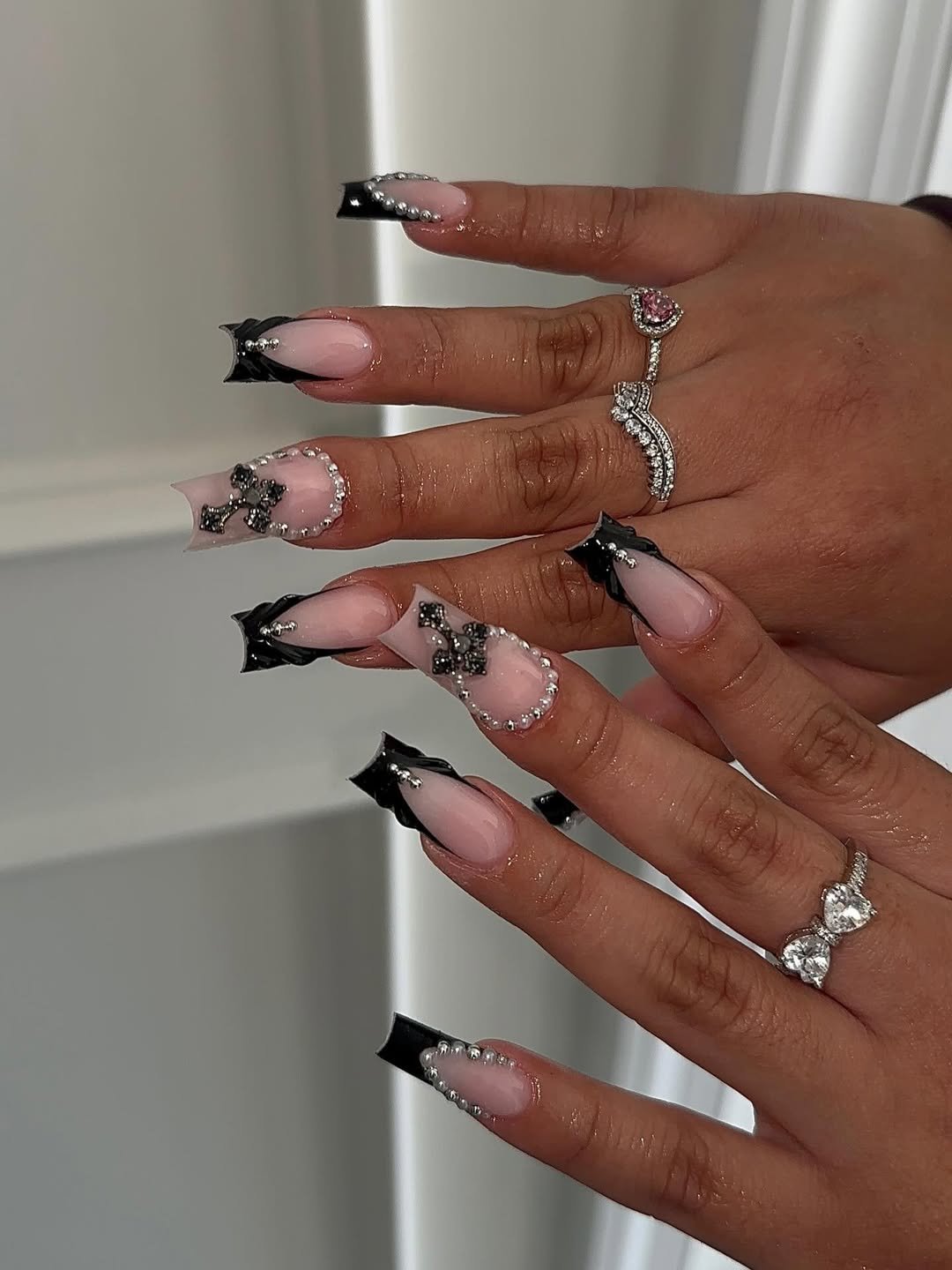 Long, sculpted nails feature sharp black French tips, framed by crystals and accented with statement crosses, embodying a dramatic aesthetic.