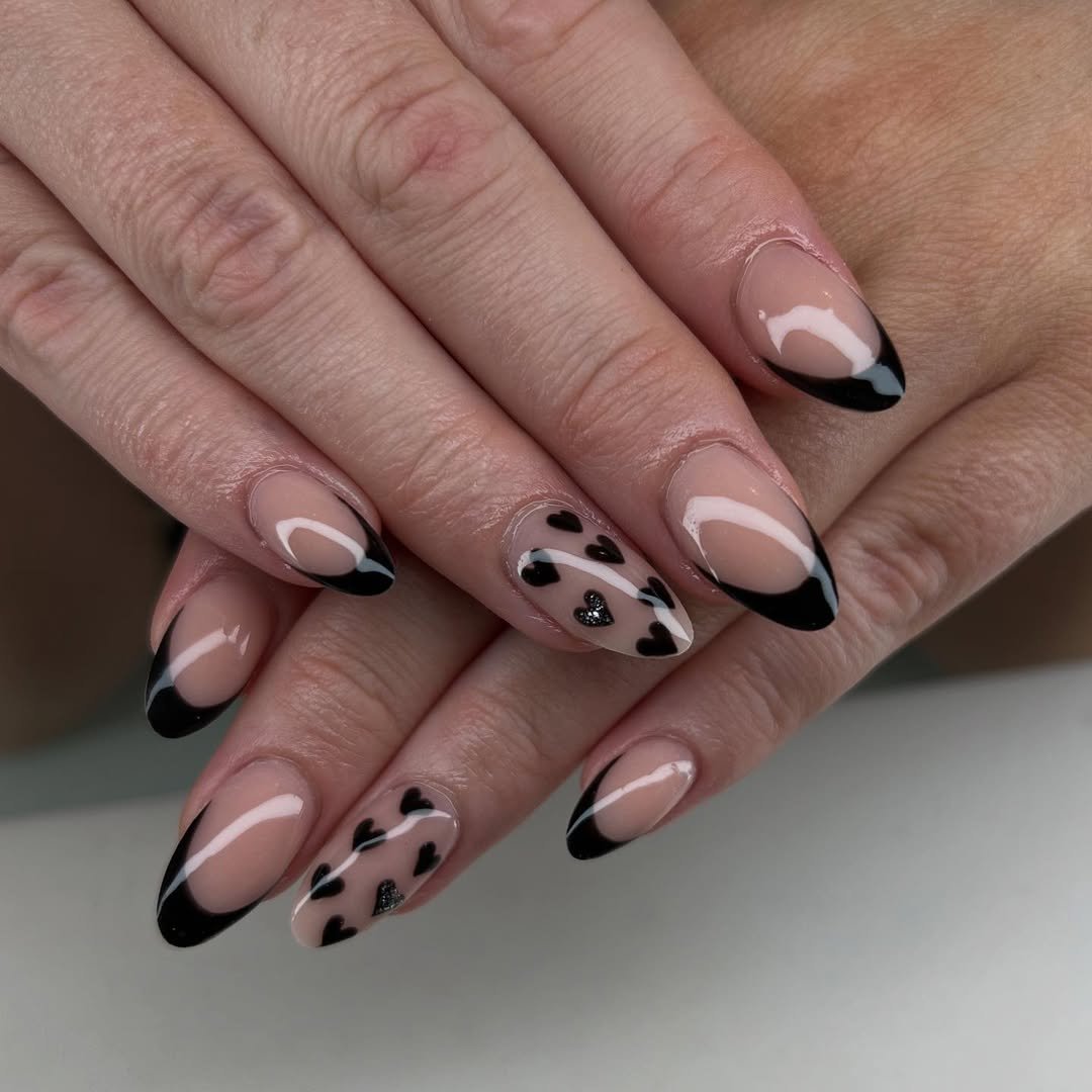 Soft nude almond nails are paired with glossy black tips, featuring one accent nail decorated with small black hearts.
