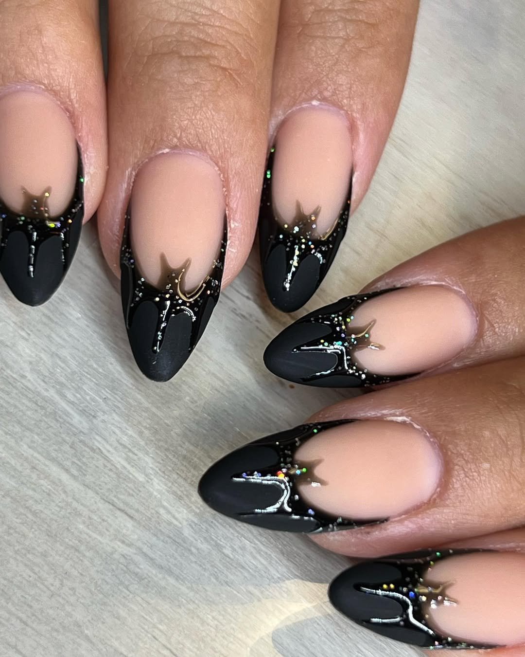 This design reimagines the French tip with matte black tips that appear to softly drip into the nude base, complemented by a subtle shimmering detail.