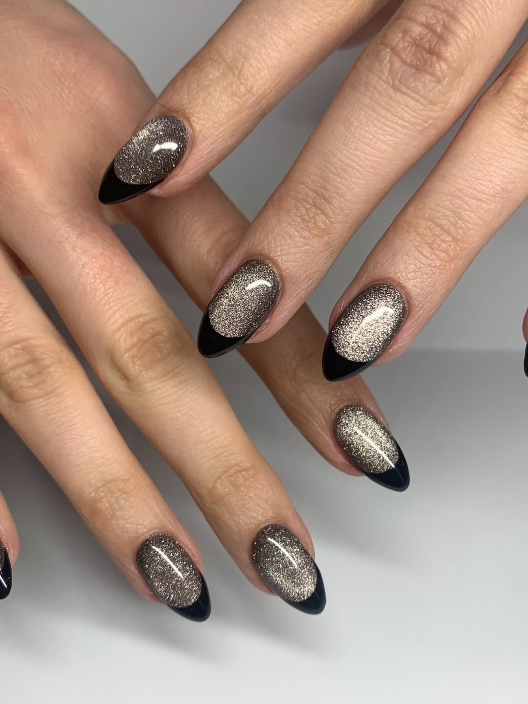 A soft metallic shimmer base seamlessly transitions into sharp black tips, creating a sleek gradient effect that feels futuristic and luxurious.