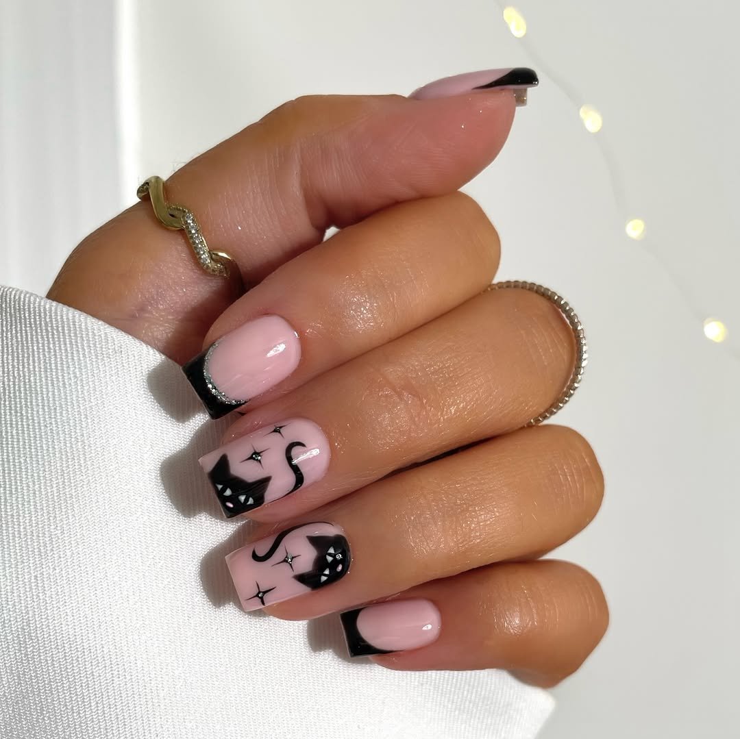Black French tips are given a whimsical touch with the addition of charming black cat motifs and small star details over a gentle pink backdrop.