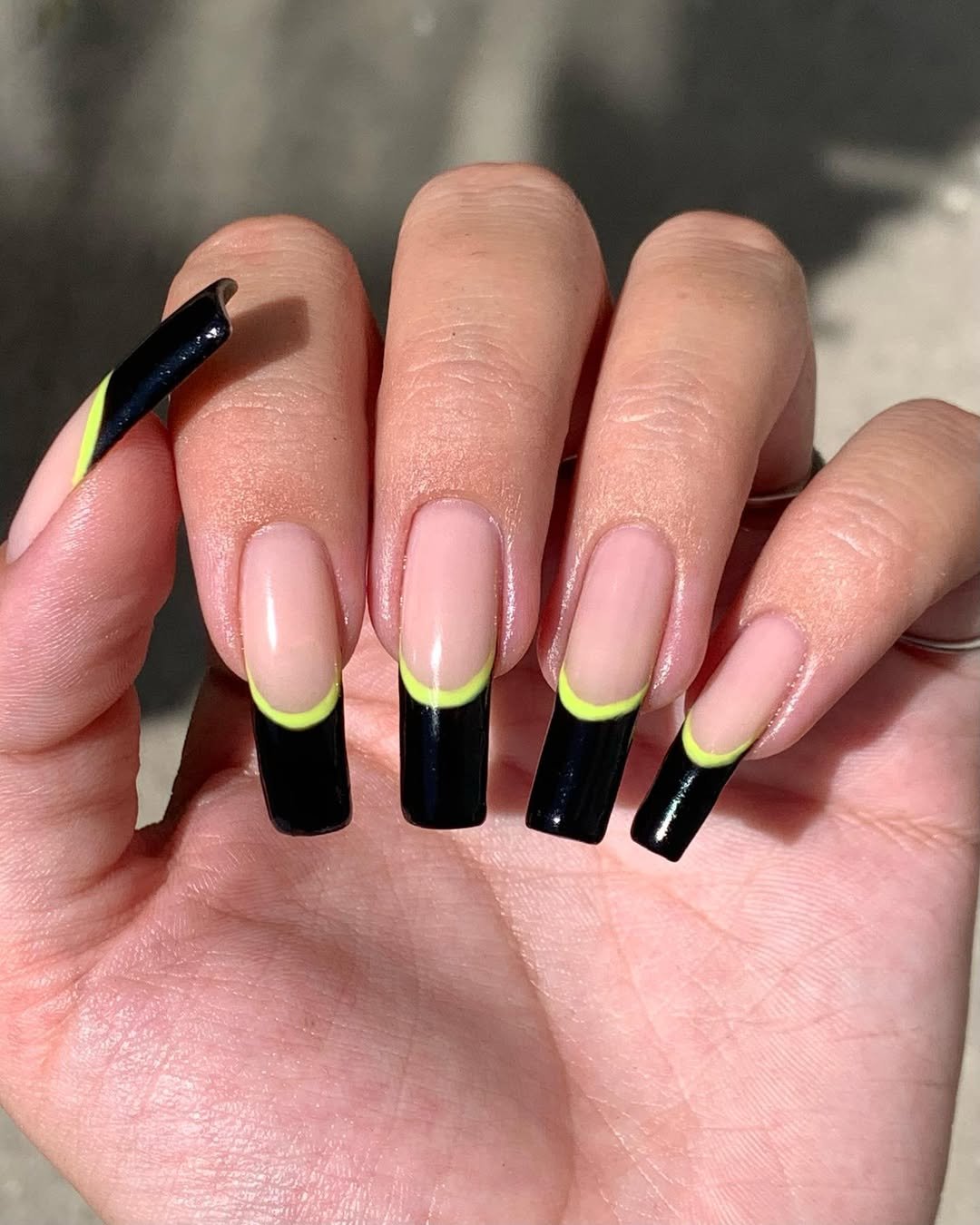 These long square nails feature bold black tips, enhanced by a thin neon yellow outline that adds an unexpected, sporty, and cool contrast.