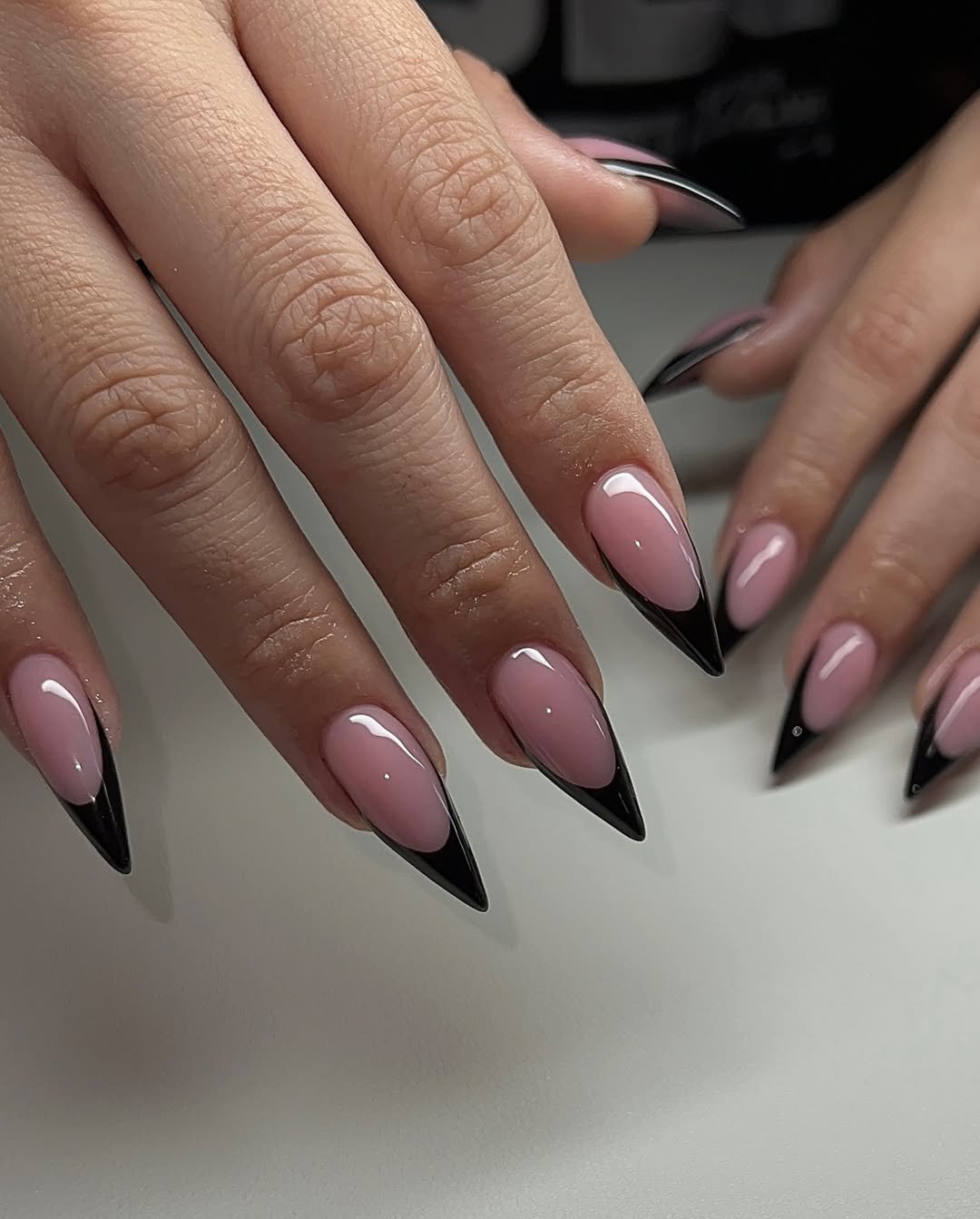 These stiletto nails are sharp and assertive, with glossy black tips precisely defining the muted pink base.