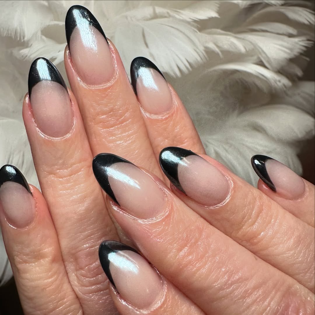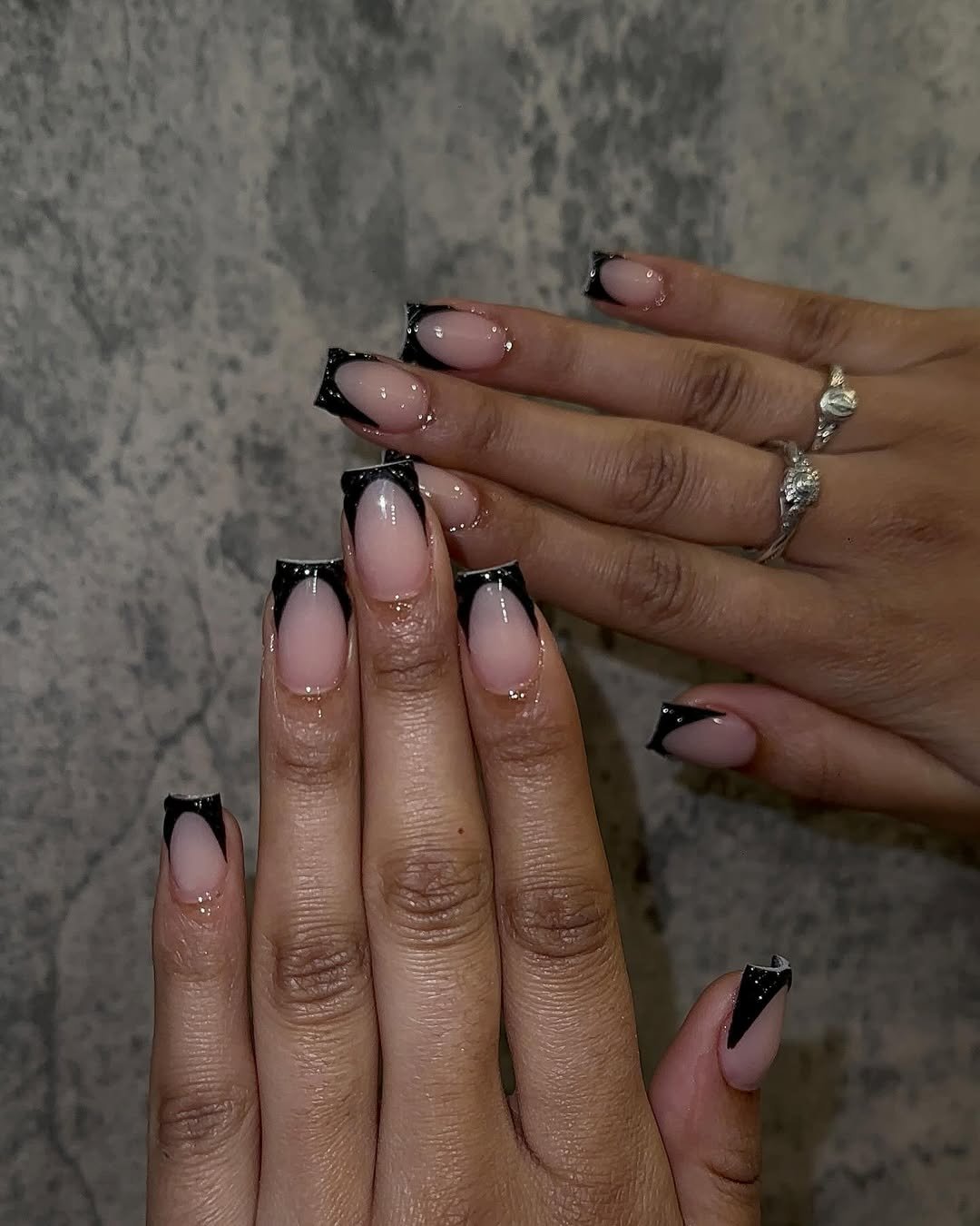 This design softens the black French effect into a subtle, smoky gradient. The transition from nude to black appears smooth and almost velvety.