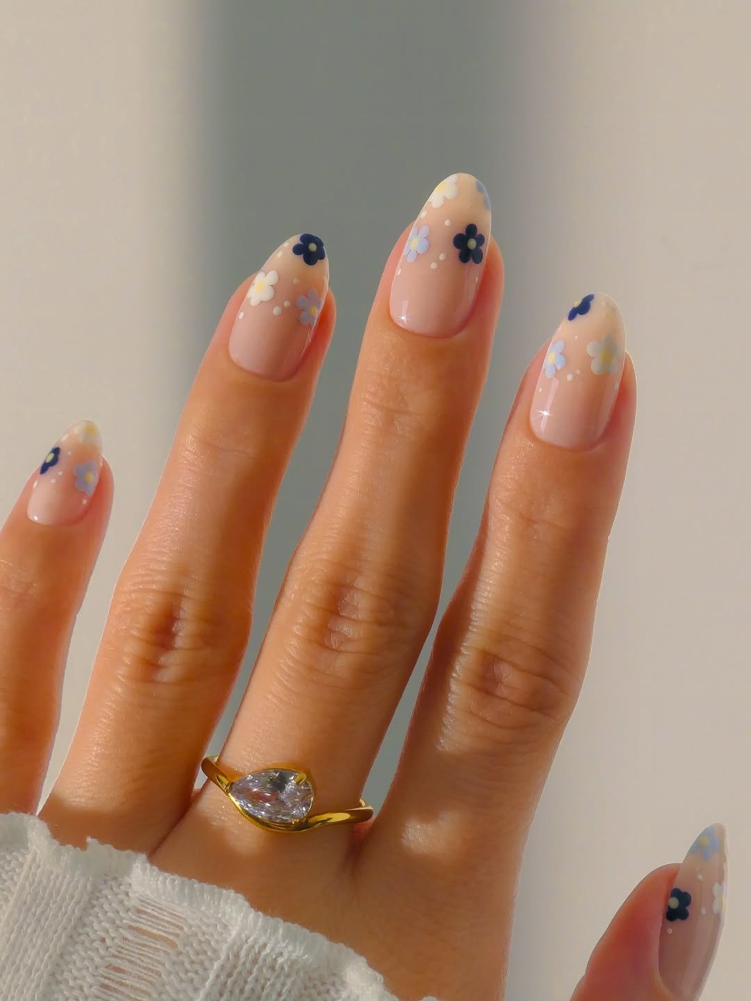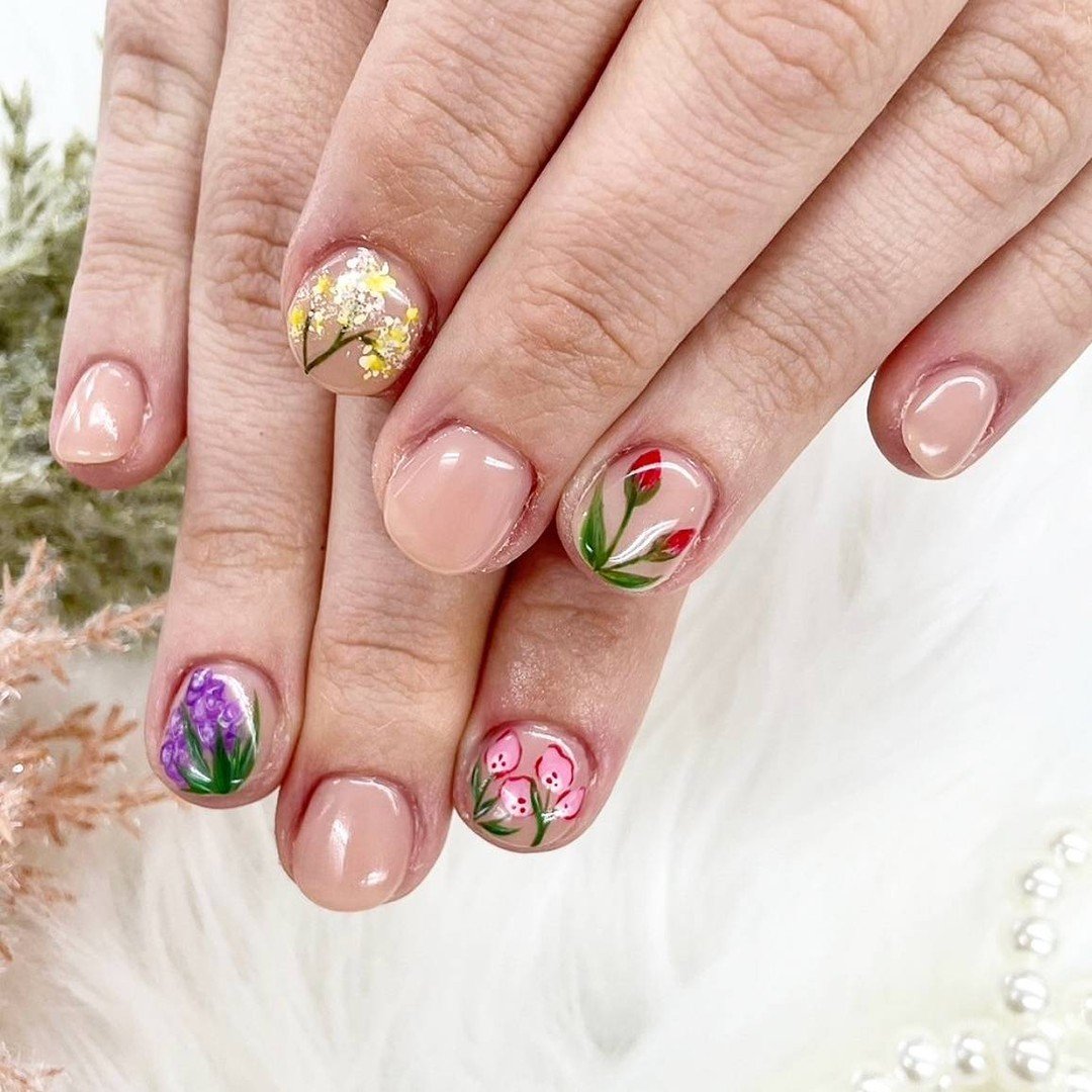 The mix of pastel flowers and airy nude base keeps everything feeling light and fresh. It’s cheerful without being loud—like the manicure version of fresh flowers on the kitchen table.