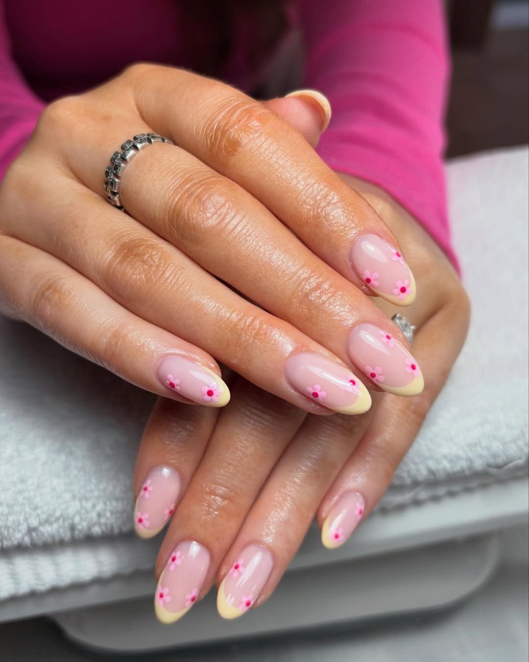 This manicure leans into soft, delicate beauty. Sheer blush nails are finished with creamy pastel French tips and tiny pink blossoms dotted across each nail.