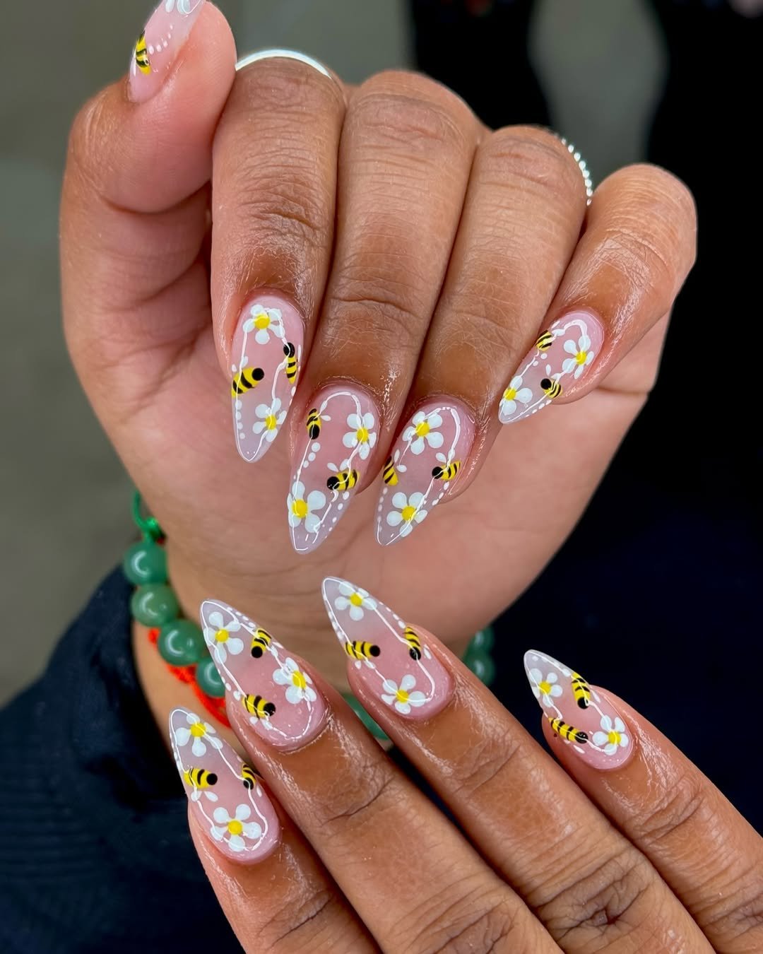 These nails are basically a tiny spring garden in motion. Soft white daisies bloom across a sheer base while adorable little bees buzz around the flowers.