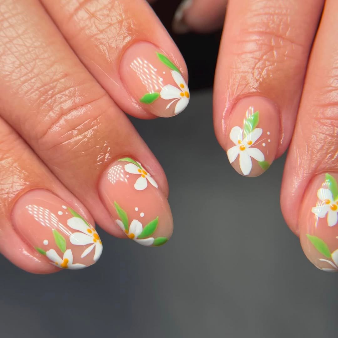 These nails feel like the first warm day of spring. A soft nude base keeps everything natural and light, while delicate white flowers and bright green leaves bring that fresh garden energy right onto your fingertips.