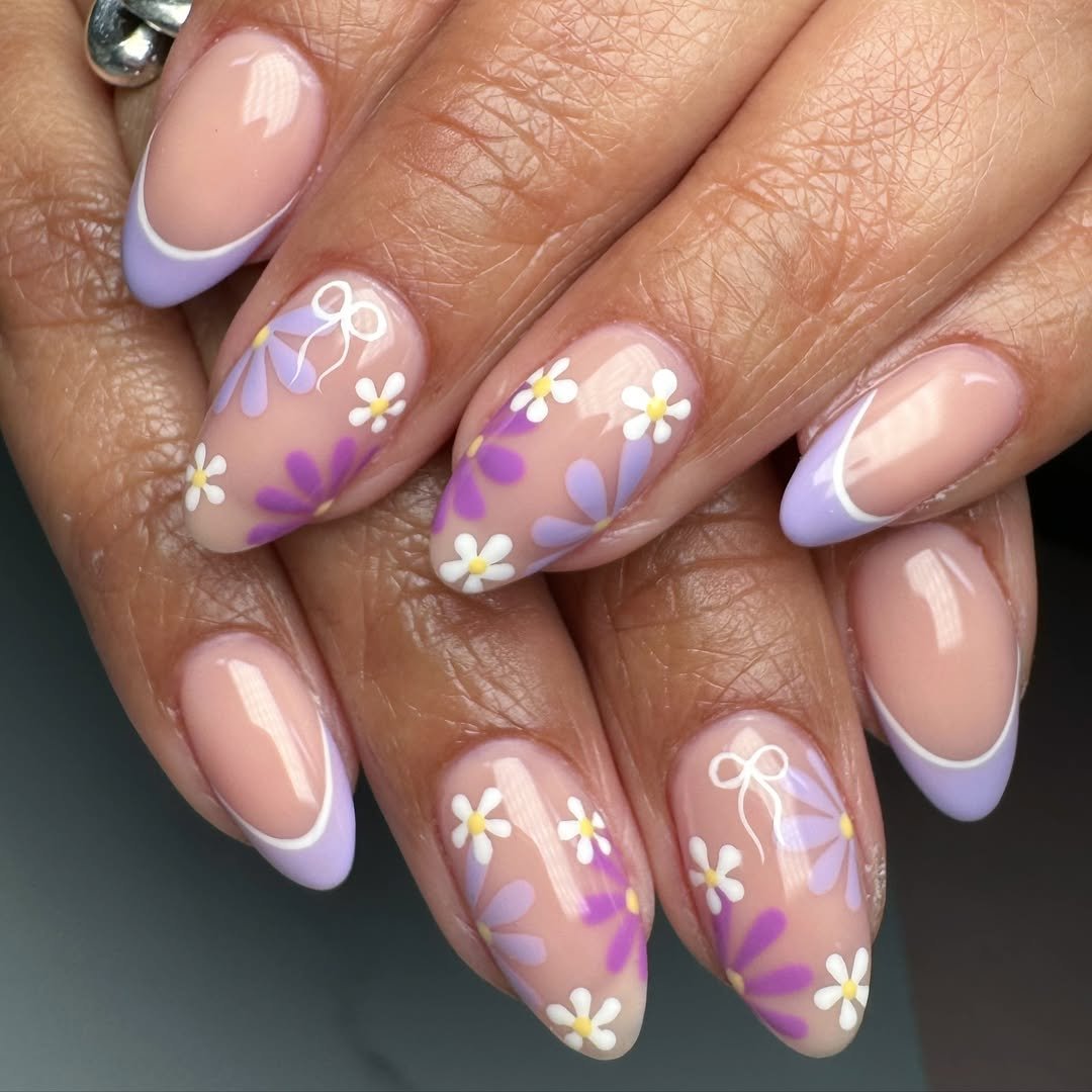 This manicure feels like spring wrapped up in the prettiest lavender ribbon. Soft nude nails are paired with lilac French tips, while delicate white daisies and airy purple petals dance across the accent nails.