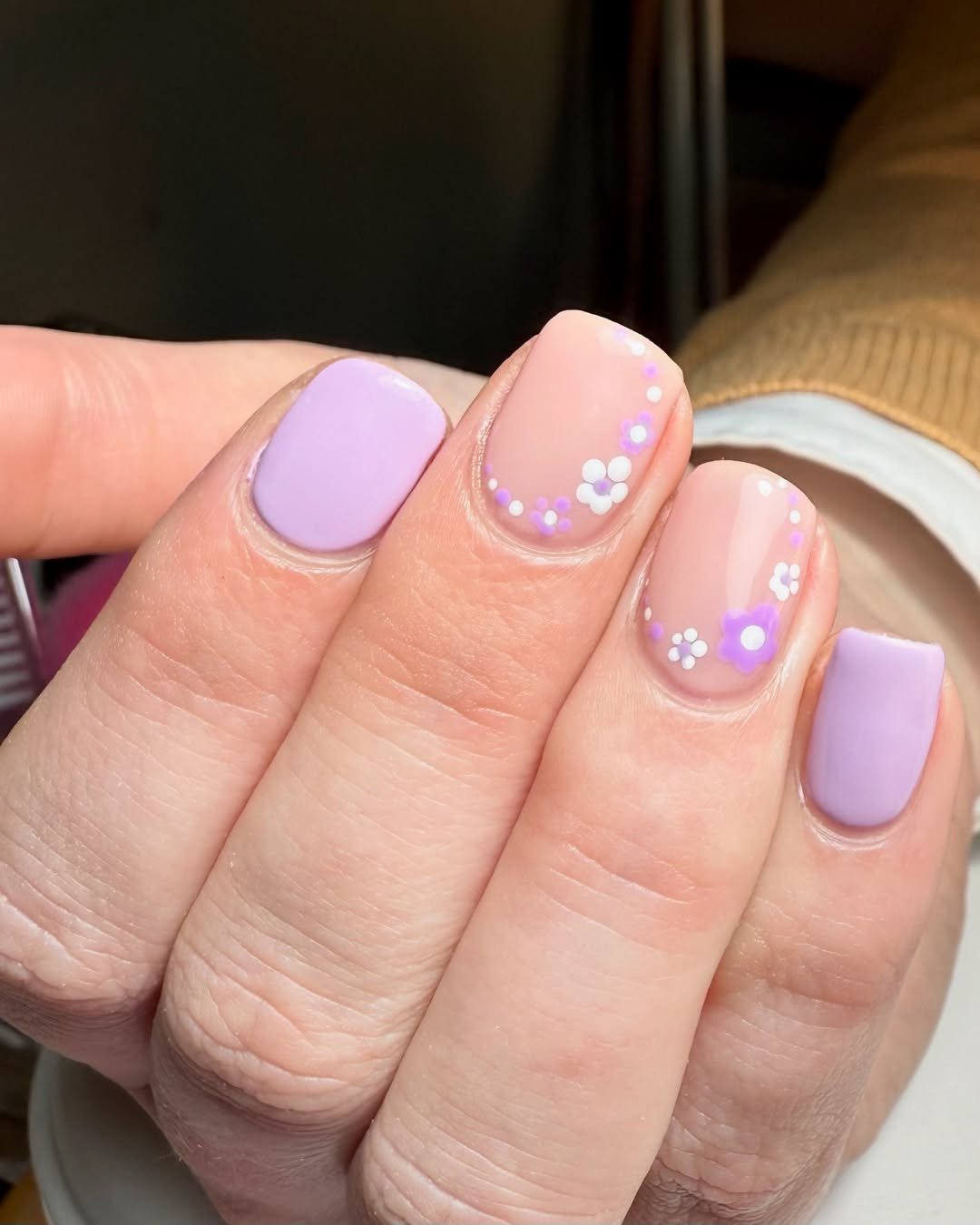 This manicure feels calm and cozy. Matte lavender nails sit beside sheer accent nails decorated with tiny purple and white flowers dotted along the cuticle line.