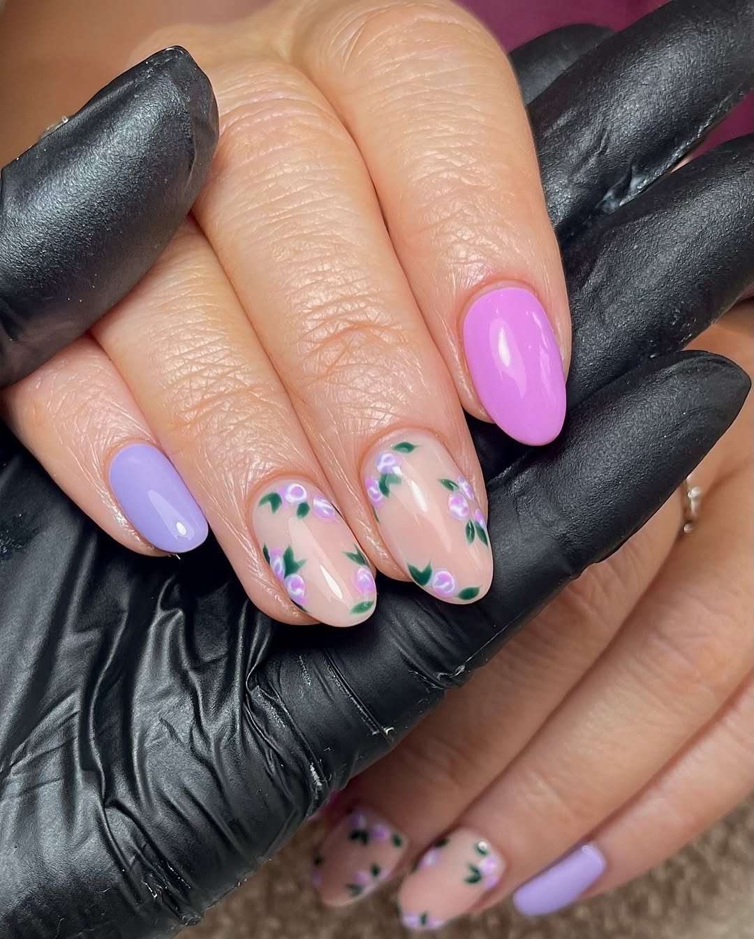 This manicure blends soft color and floral detail in the prettiest way. Glossy lavender nails sit beside nude accent nails covered in tiny purple blossoms and leafy green vines.