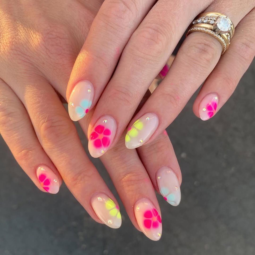 If spring had a neon filter, it would look like this. Sheer milky nails glow with vibrant hot pink, lime green, and soft blue flowers scattered across the surface.