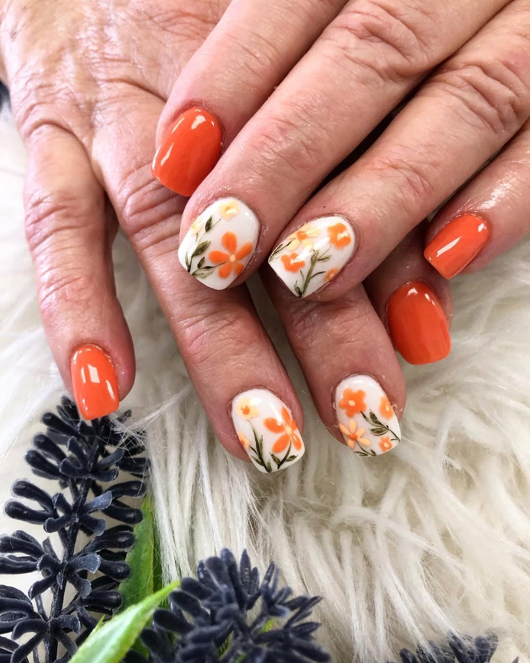 Bright orange polish paired with soft floral art makes this set instantly eye-catching. The white accent nails are decorated with orange flowers and leafy details that give the whole look a warm, sunny vibe.