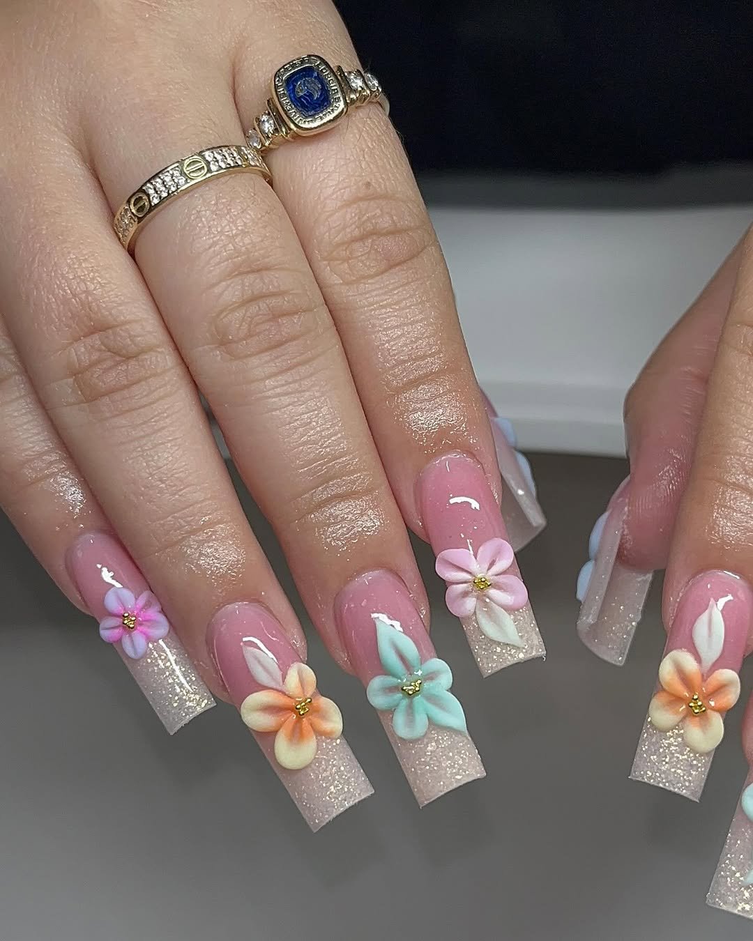 This set turns floral nails into tiny pieces of sculpture. Long square tips shimmer with glitter while soft pastel 3D flowers bloom across the nails in peach, mint, and baby pink tones.
