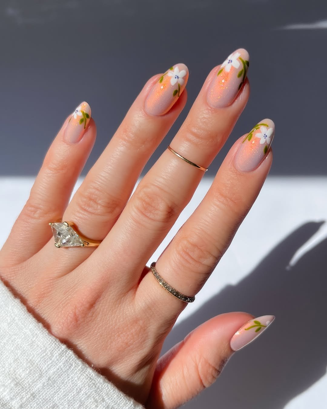 These nails feel warm and glowing, almost like a sunset captured on your fingertips. A soft peachy shimmer base gives the design a luminous look, while delicate white flowers bloom gently along the edges.