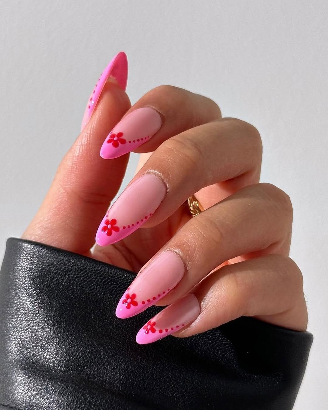 This design takes a classic pink manicure and gives it a playful little twist. Soft blush nails fade into brighter pink tips, finished with tiny red flower accents that feel both cute and modern.