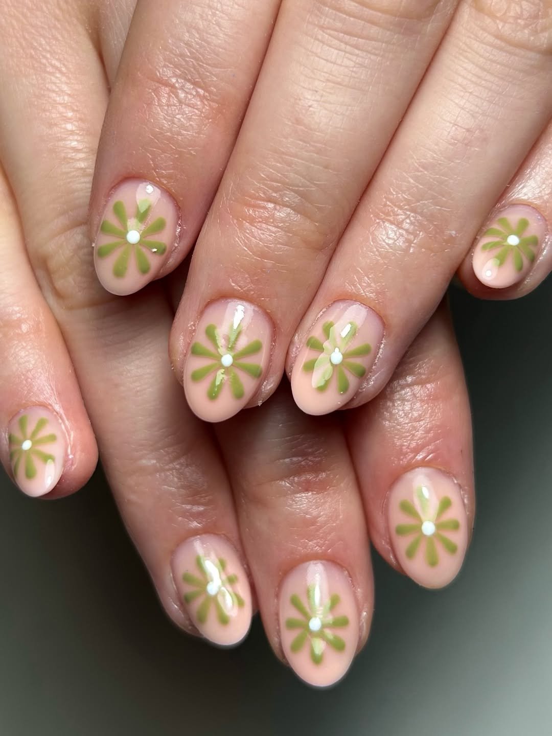 These nails lean into that cool retro floral look. Muted green petals bloom over a neutral base, creating a simple but graphic flower pattern that feels modern and slightly vintage at the same time.
