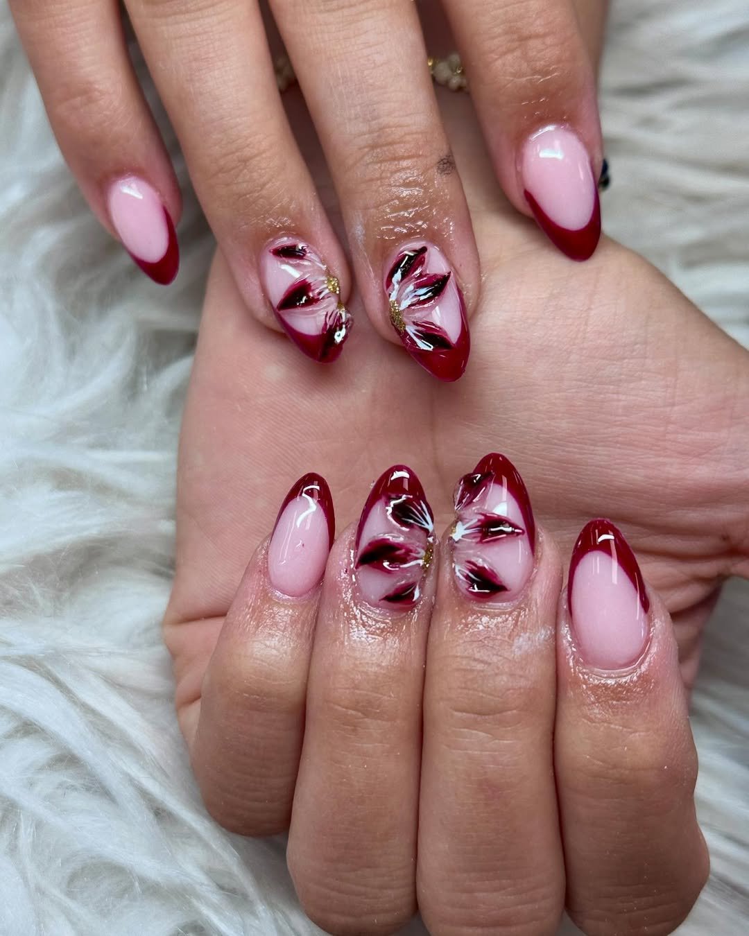Classic French tips get a bold glow-up here. Deep ruby red tips bring drama, while hand-painted petals bloom across the center nails with soft white strokes and tiny gold accents.