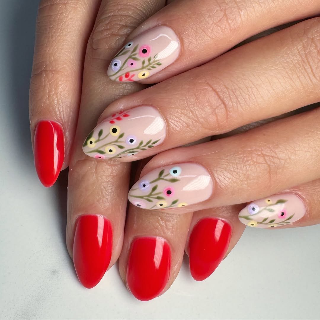 Bold red nails bring instant energy to this set, while the accent nails soften the look with delicate pastel florals and leafy green stems.