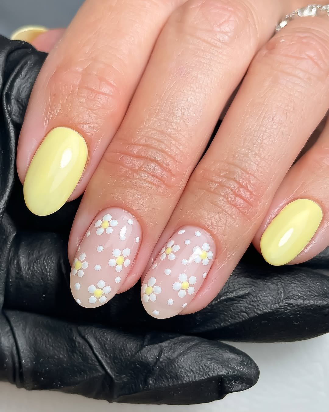 This manicure looks like a tiny meadow of daisies. A gentle nude base lets the white flowers with yellow centers pop, while the soft yellow polish on the other nails ties the whole look together.