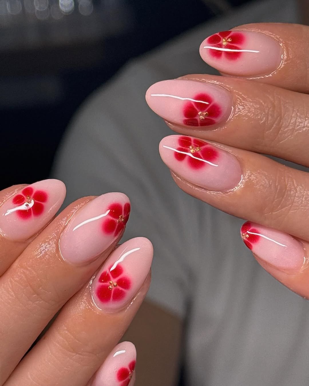 These nails have such a soft, almost watercolor-like effect. Blurred red flowers bloom gently over a sheer pink base, creating a dreamy and romantic look.