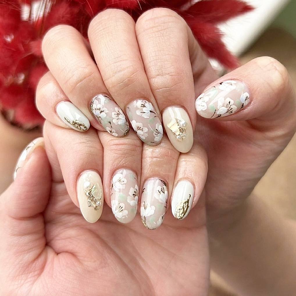These nails lean into a soft vintage aesthetic. Neutral beige tones create the base while delicate white blossoms and tiny gold accents scatter across the nails like pressed flowers in a journal.