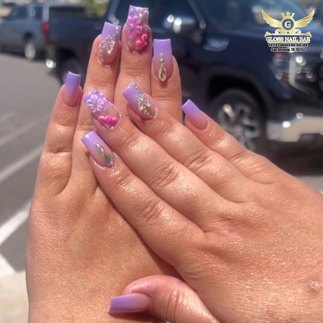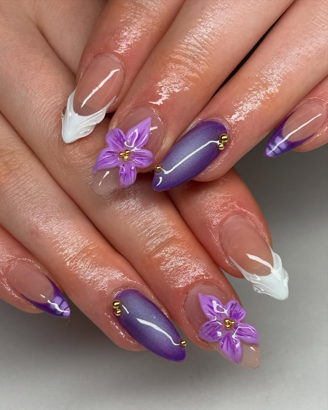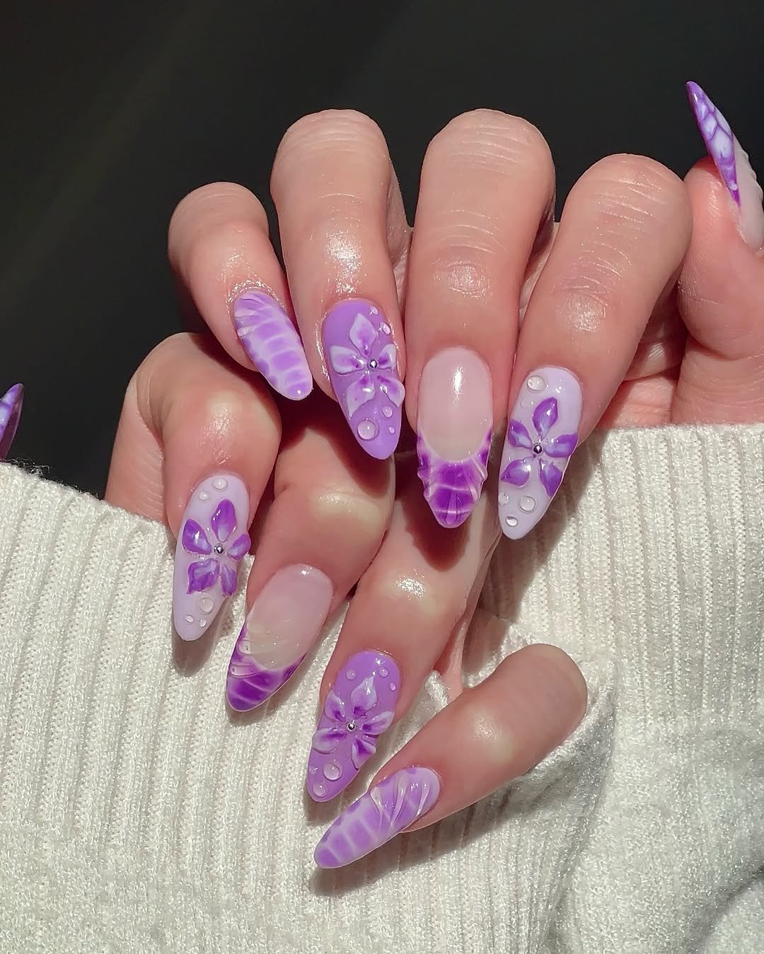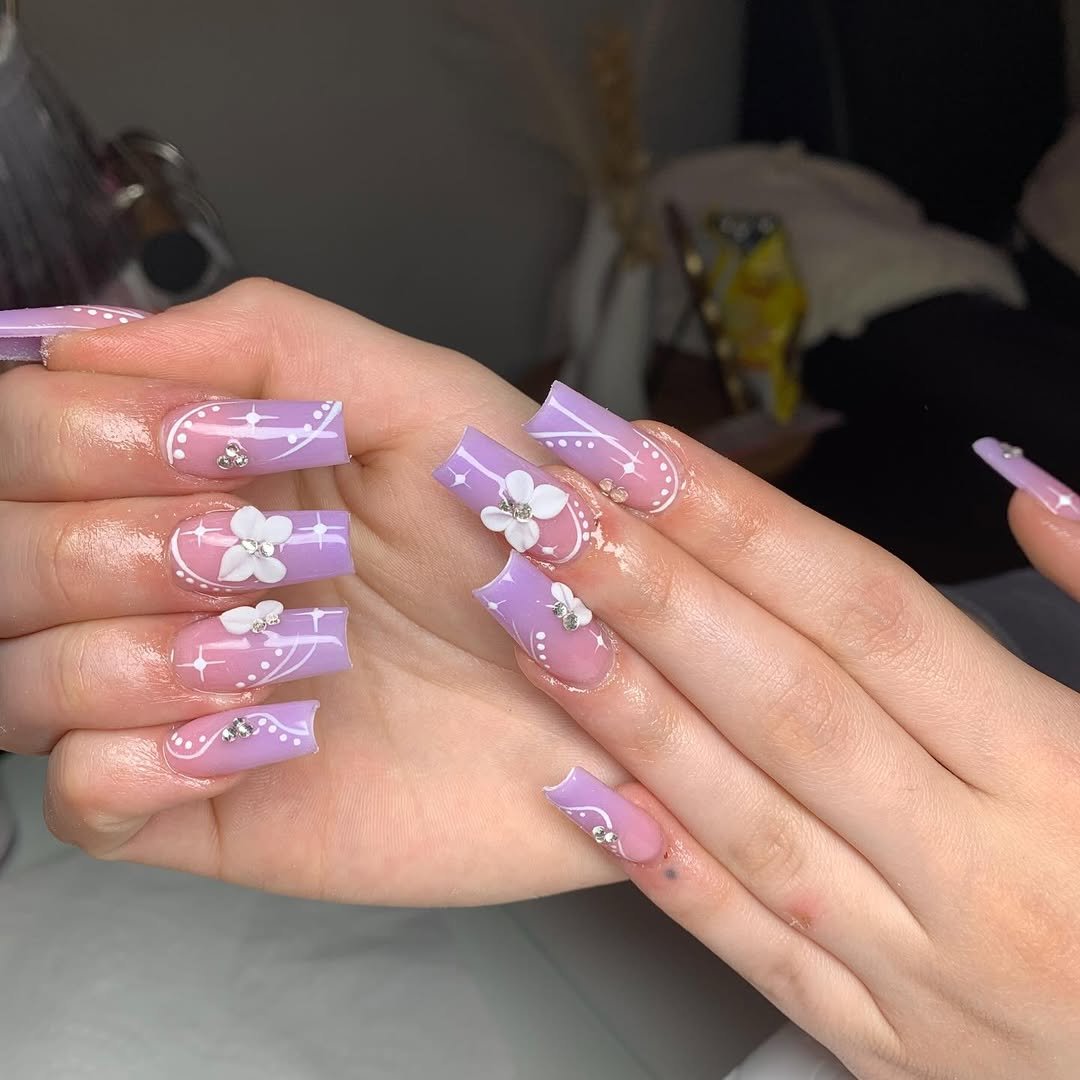 This set emphasizes texture with raised floral details, glossy finishes, and soft purple tones, resulting in a luminous, dimensional effect. It feels fresh, artistic, and akin to nails that have naturally bloomed.