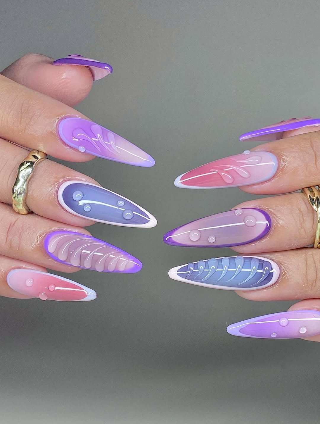This artistic nail design utilizes a combination of translucent jelly finishes, layered purple tones, and raised gel embellishments to achieve a novel, almost fluid aesthetic that is visually striking.