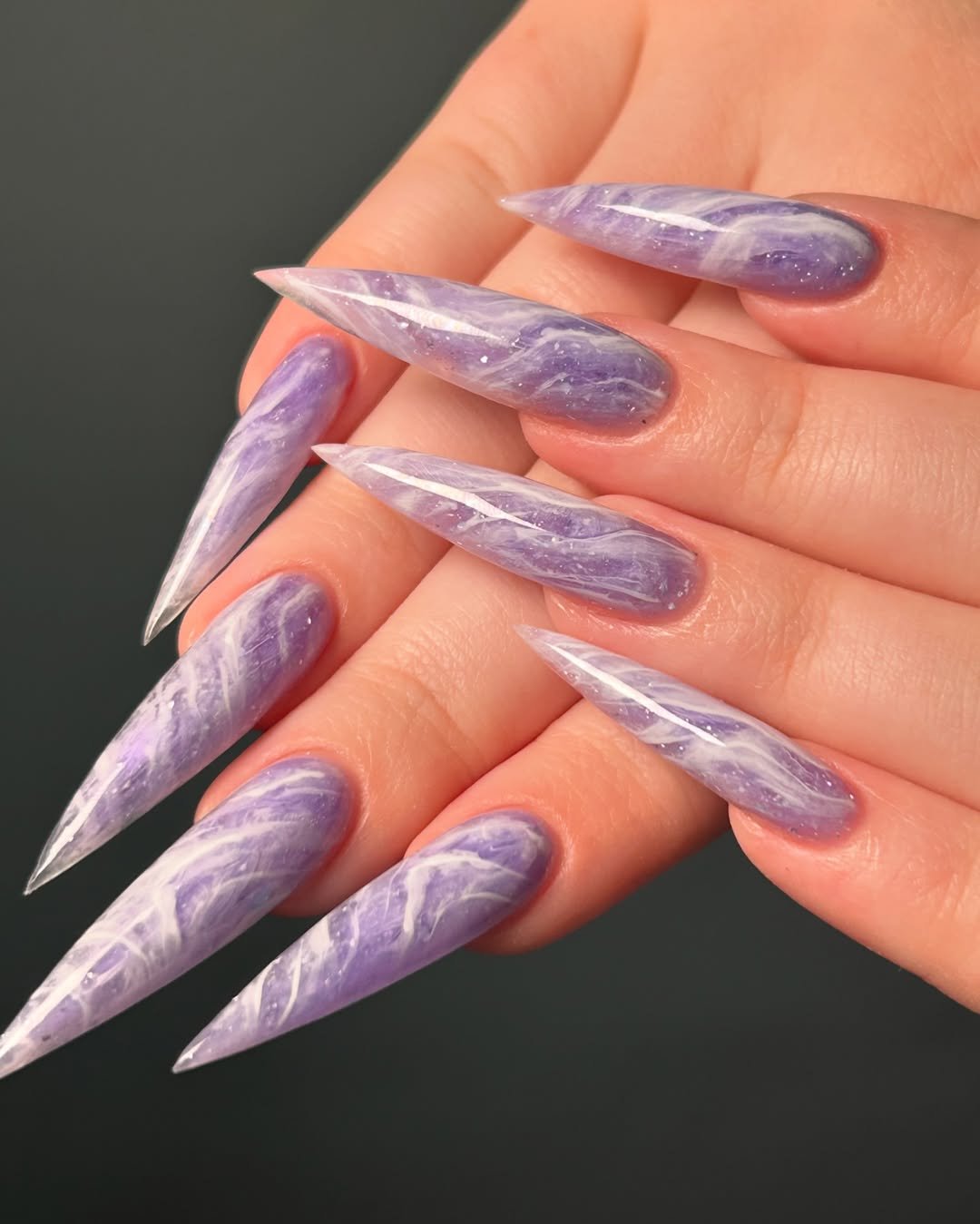 These nails evoke the appearance of miniature amethyst stones, featuring soft lilac swirls interspersed with milky white veins and a hint of shimmer. The sharp stiletto shape accentuates the dramatic effect, lending them a high-fashion, almost mystical aura. This design offers a dreamy yet powerful statement, perfect for those seeking a manicure with significant presence.