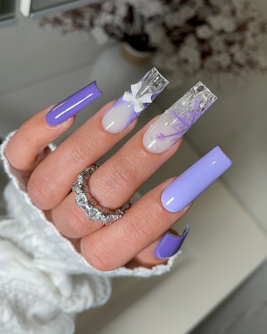 This nail set artfully combines soft lilac tones with icy white accents, rhinestones, and textural elements, creating a look that bridges winter and spring aesthetics. It offers an elegant yet attention-grabbing appearance, akin to a subtly sparkling frosted finish.