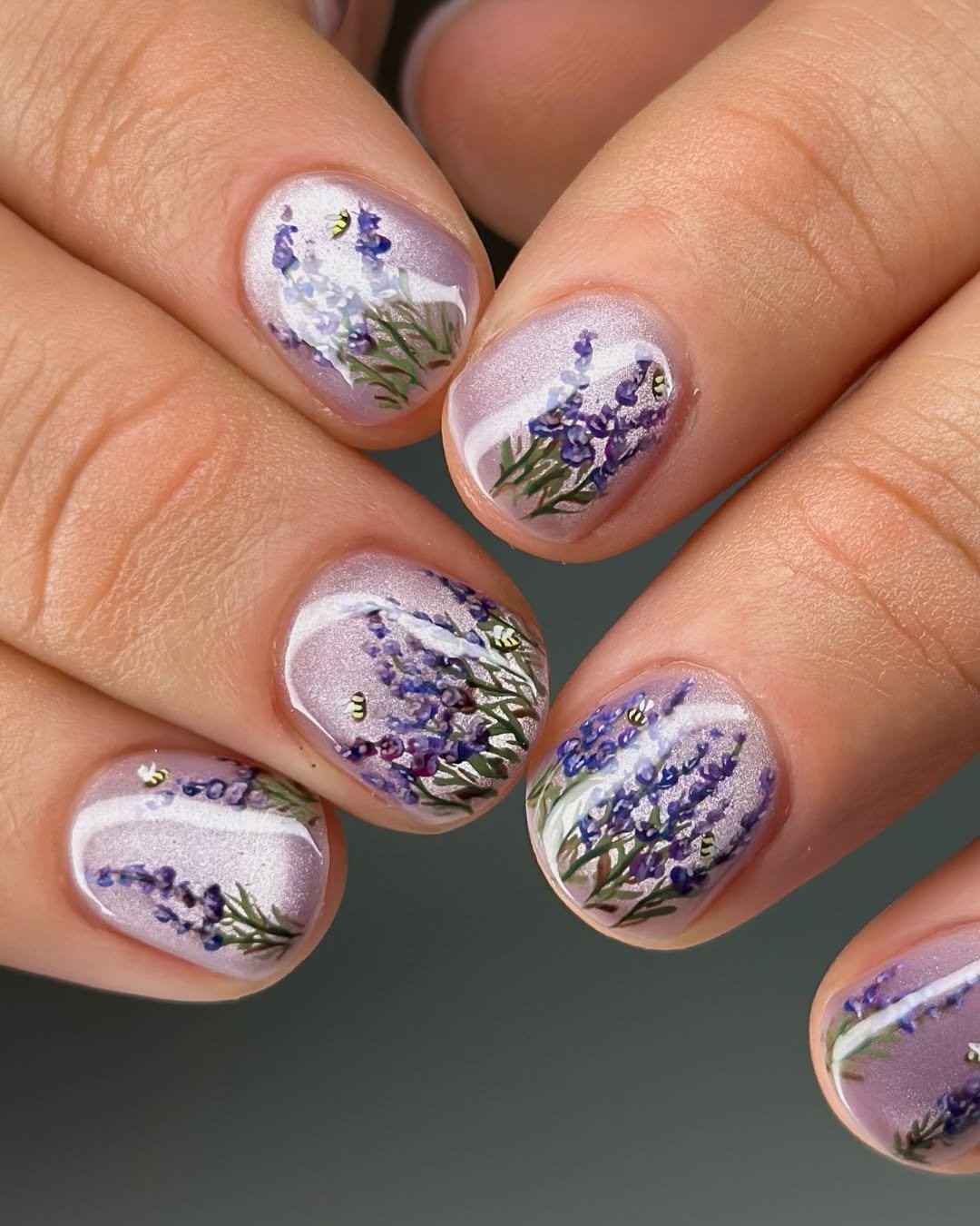 This intricate set tells a story, featuring tiny lavender sprigs painted over a soft, shimmering base, enhanced with delicate bee motifs. It captures the essence of a miniature garden adorning your nails. The overall impression is one of tranquility, meticulous detail, and poetic charm, as if carrying a serene spring moment with you wherever you go.