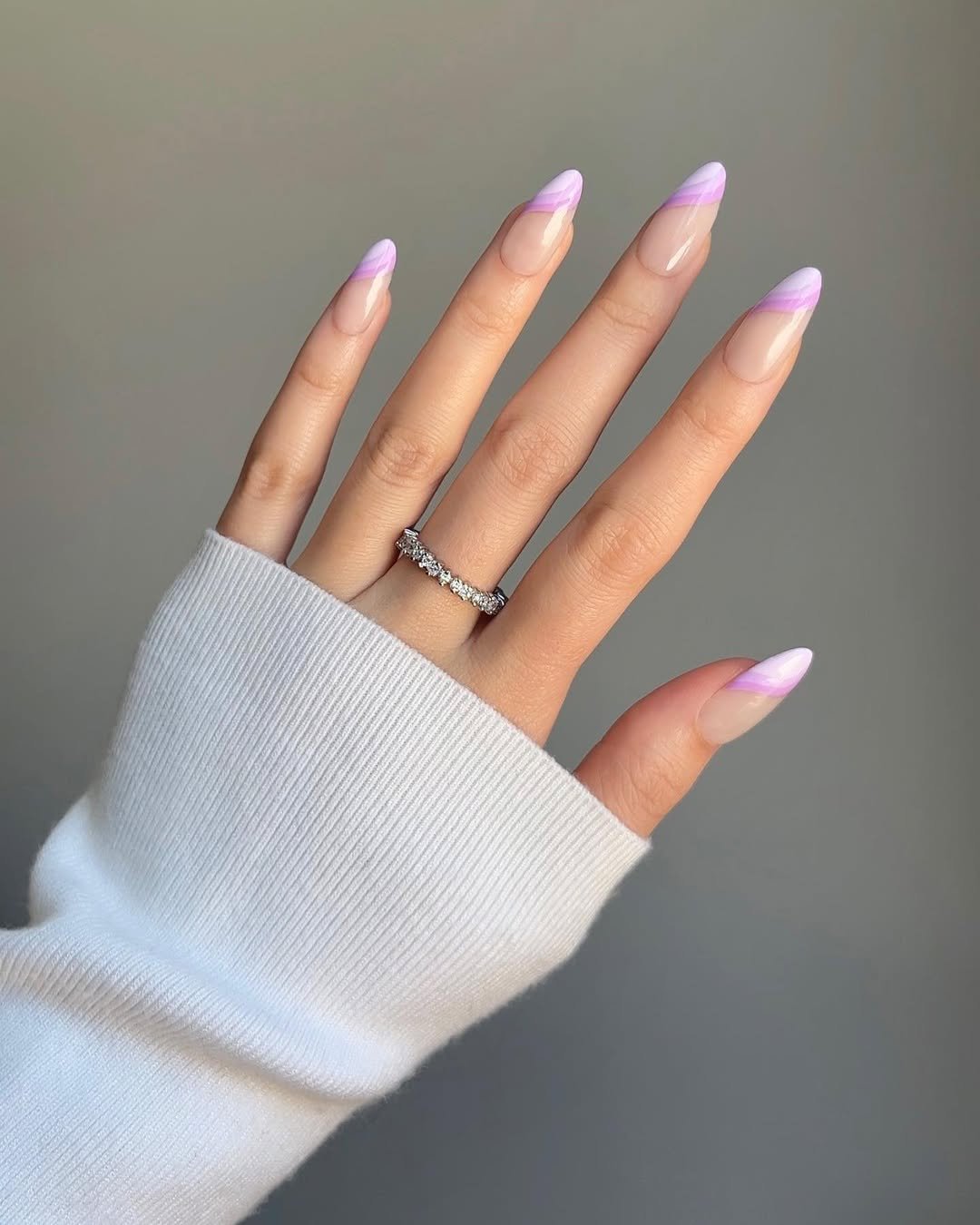This take on the French tip style features faded lilac hues on a nude base, offering a clean yet distinctive look that is both subtle and highly adaptable for various occasions.