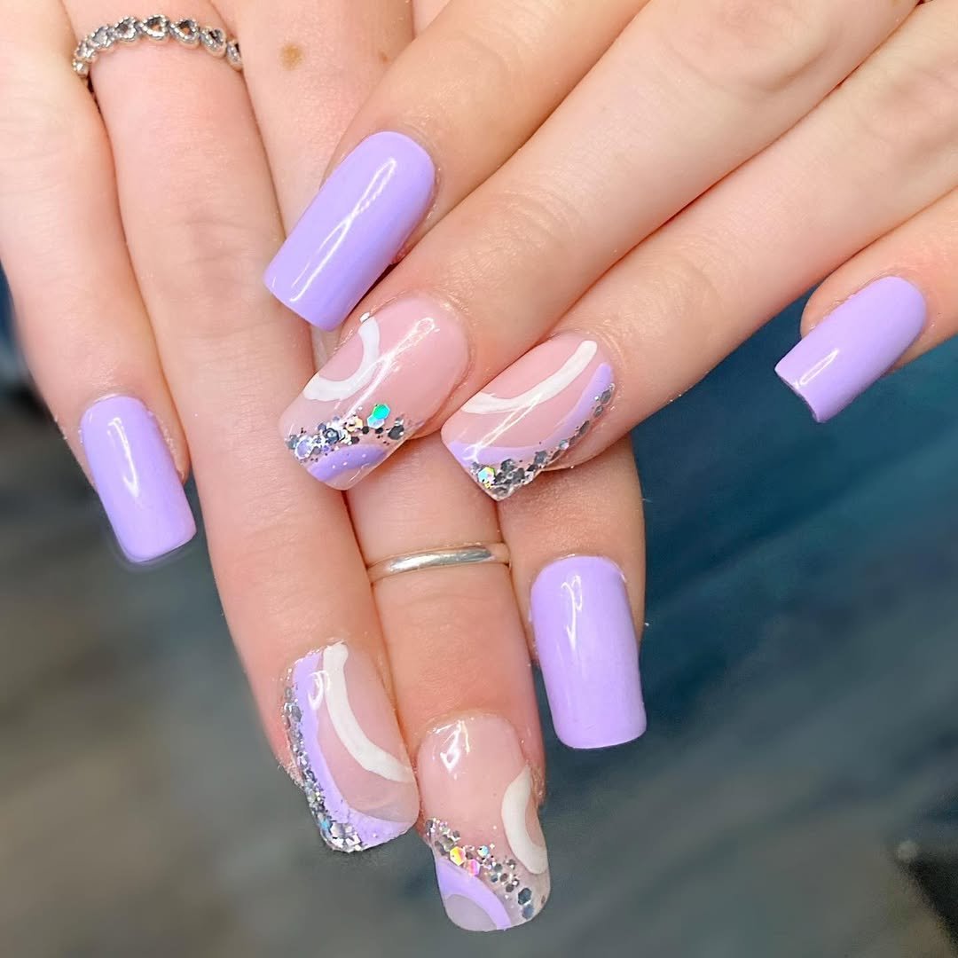 This set feels like a celebration, combining a soft lilac shimmer with chunky purple and holographic confetti pieces to create a fun, party-ready yet elegant vibe. It strikes a balance between playfulness and polish, offering an eye-catching look without appearing chaotic.