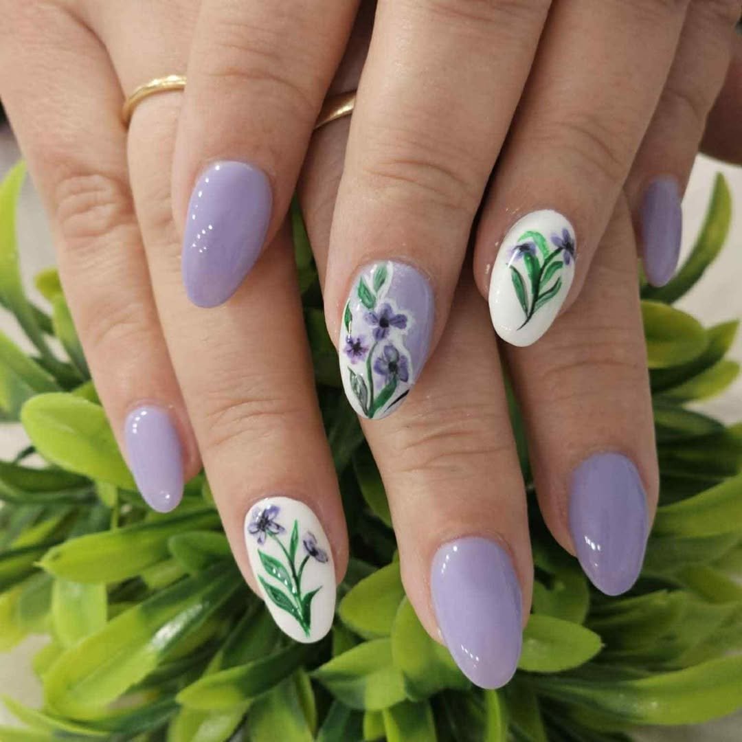 This design elegantly combines soft lavender nails with delicate, hand-painted floral motifs on a nude base, achieving a harmonious and nature-inspired look. It conveys a gentle and feminine feel, reminiscent of a tranquil spring morning translated into nail art.