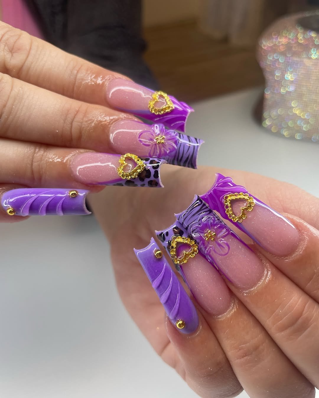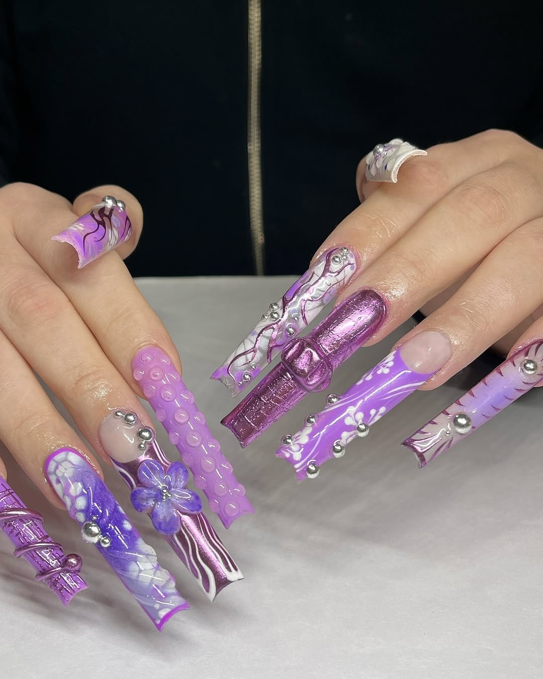 This design presents an audacious and visually rich experience with long, sculpted nails adorned with multiple textures, chrome effects, 3D elements, and layered purple shades, creating a dramatic and impactful look.