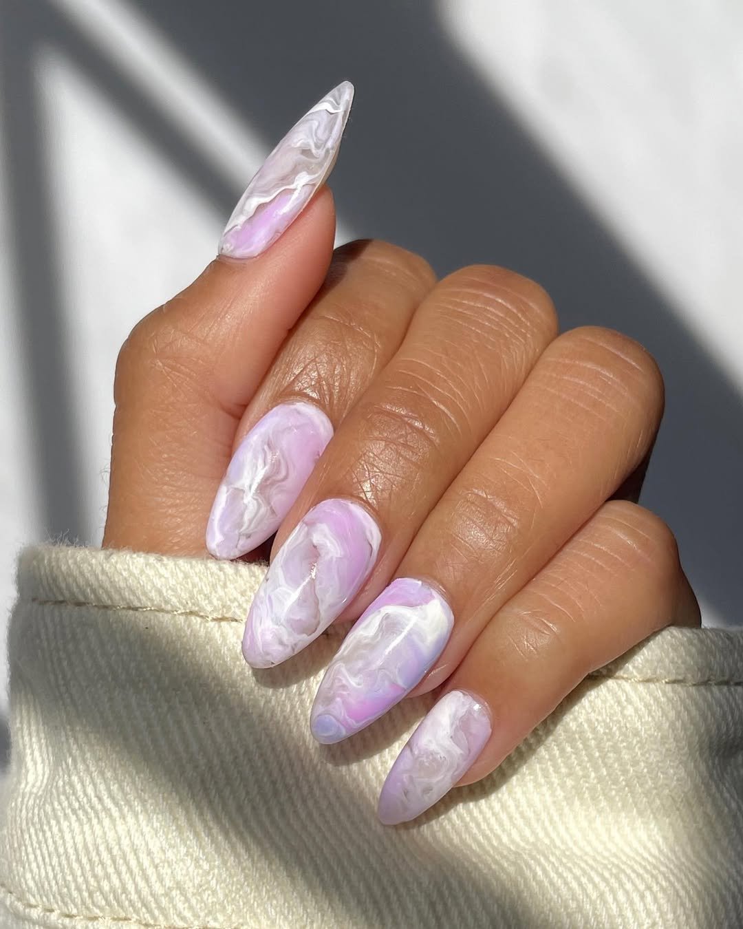 These nails exude soft luxury, featuring a creamy white and pale lavender marble effect that blends seamlessly, creating an illusion of silk wrapped around the nails. This design is serene, sophisticated, and highly aesthetic, offering an understated yet expensive look.