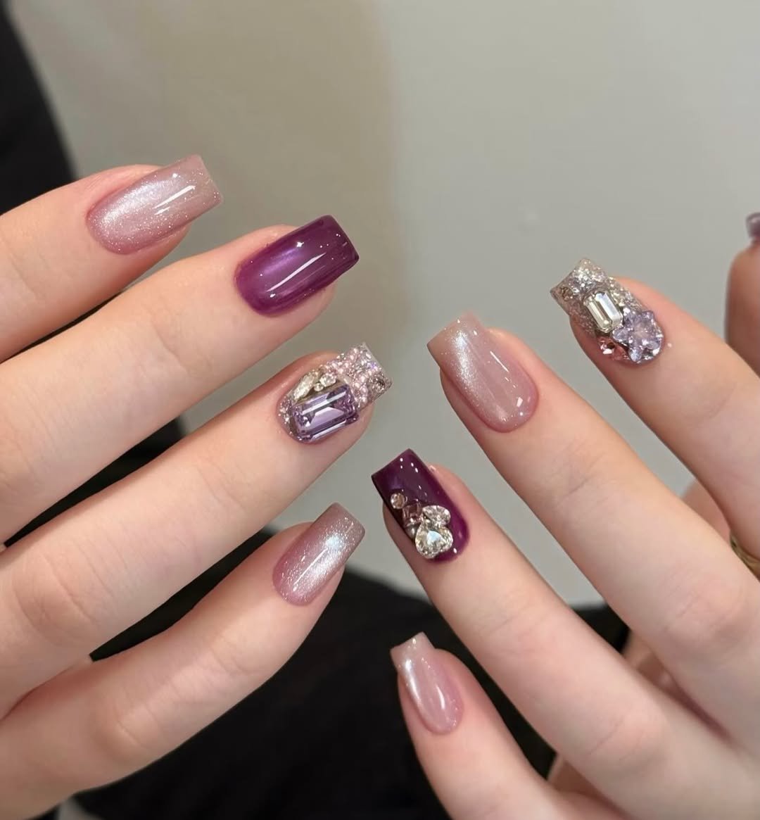 This style exudes luxury, combining deep plum shades with glossy nudes and prominent crystal decorations to achieve a rich, jewelry-like finish. It is a bold and assertive statement, a set of nails that commands attention and serves as a striking accessory in itself.