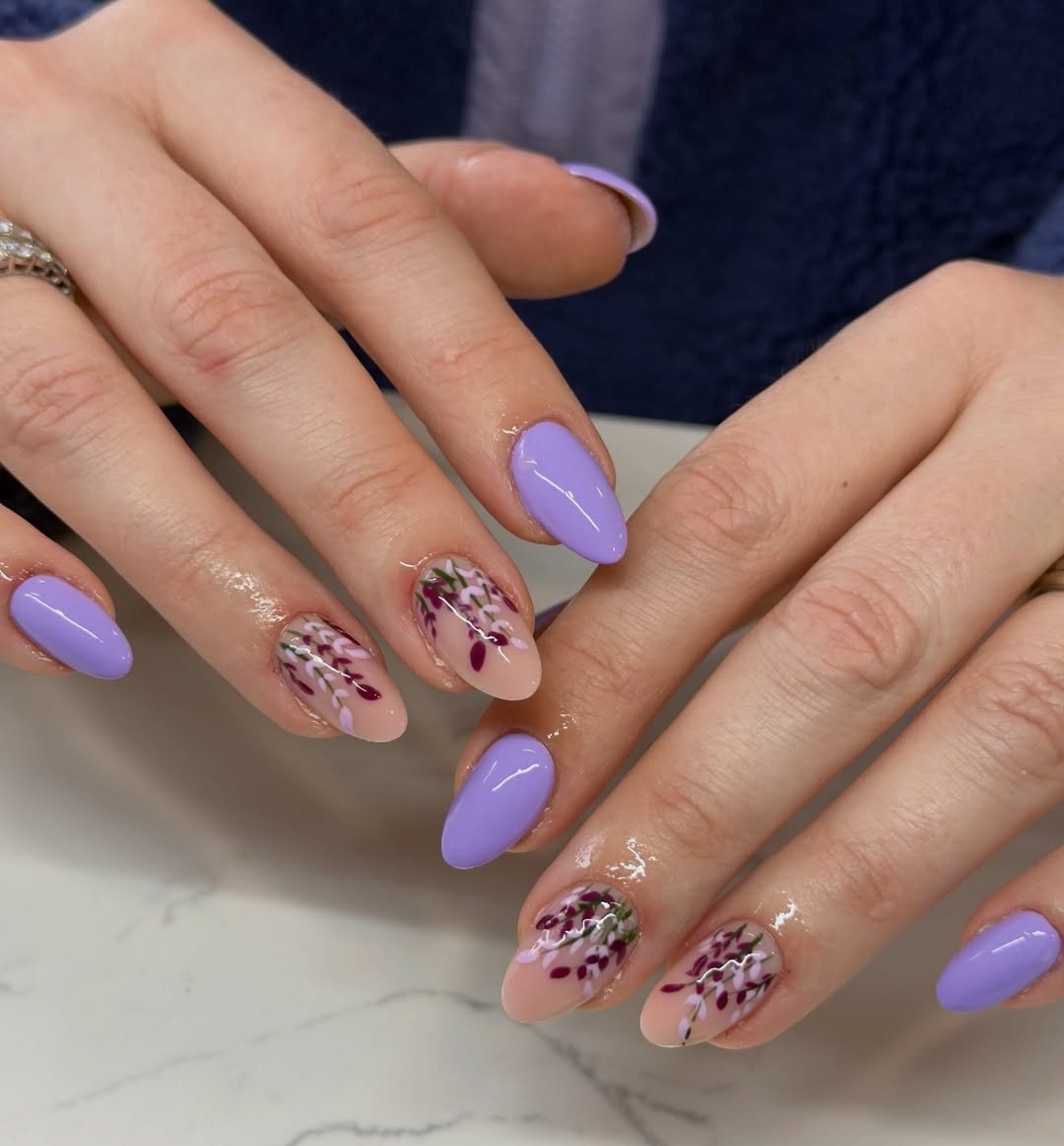 This design harmonizes soft lavender nails with delicate floral artwork on a nude base, creating a balanced, nature-inspired aesthetic that feels gentle and feminine.